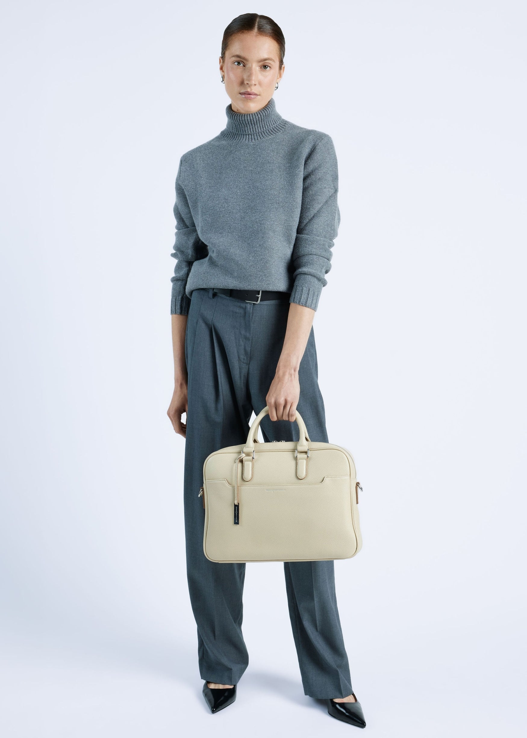 The bag offers enough space to safely store laptops up to 15 Inch along with additional pockets and compartments for organizing documents, notebooks, pens and other accessories. The bag is made of soft and supple cowhide leather. Features multiple interior pockets and is lined with suedine (viscose) material. With the removable, adjustable shoulder strap, you can also wear this handbag as a crossbody bag.