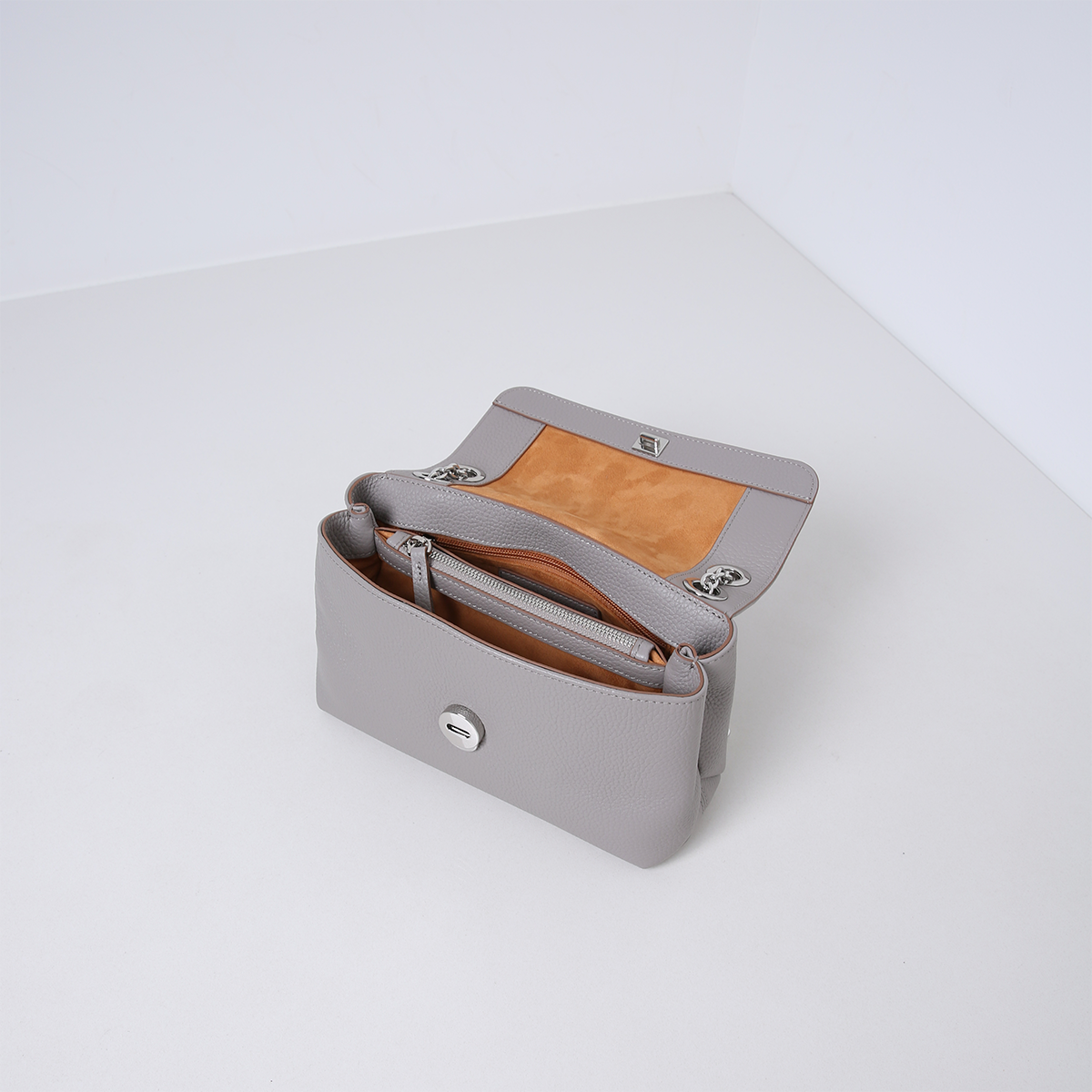 The bag has two compartments on the inside, separated by a center zippered pocket. It also features several interior pockets and is lined with suedine (viscose) material. The bag opens on the front and closes with a snap closure. On the center silver hardware chain, the bag is finished with leather, so it can be worn smoothly and comfortably on the shoulder. The bag is made of soft and supple leather.