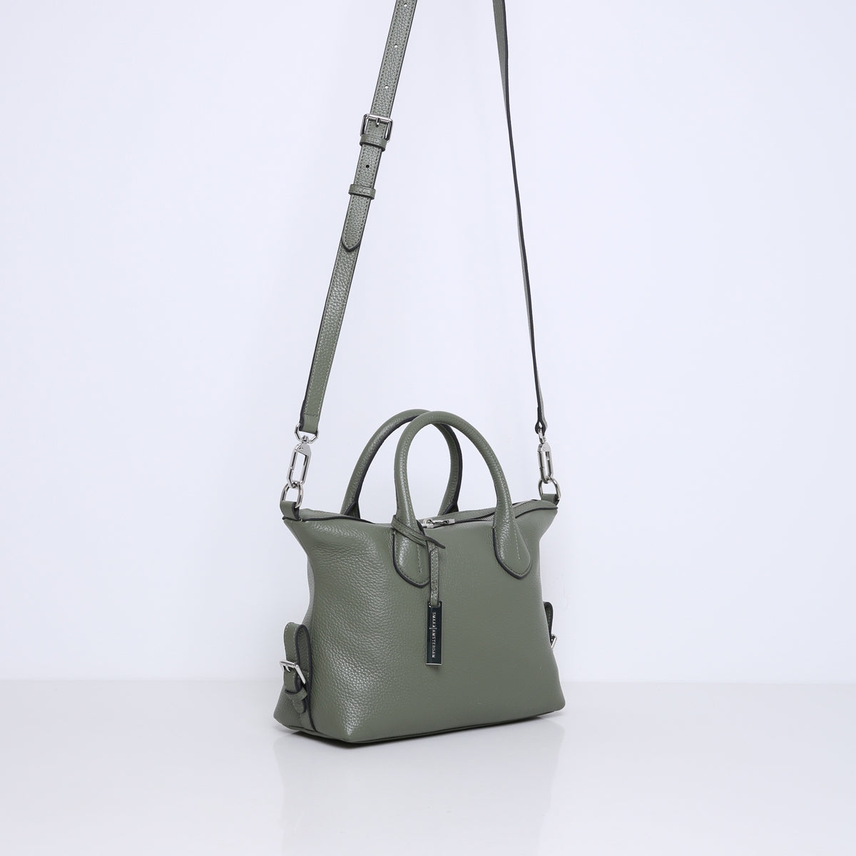 The bag is made of soft and supple cowhide leather. Features multiple interior pockets and is lined with suedine (viscose) material. With the detachable, adjustable leather shoulder strap you can also wear this handbag as a crossbody bag.
