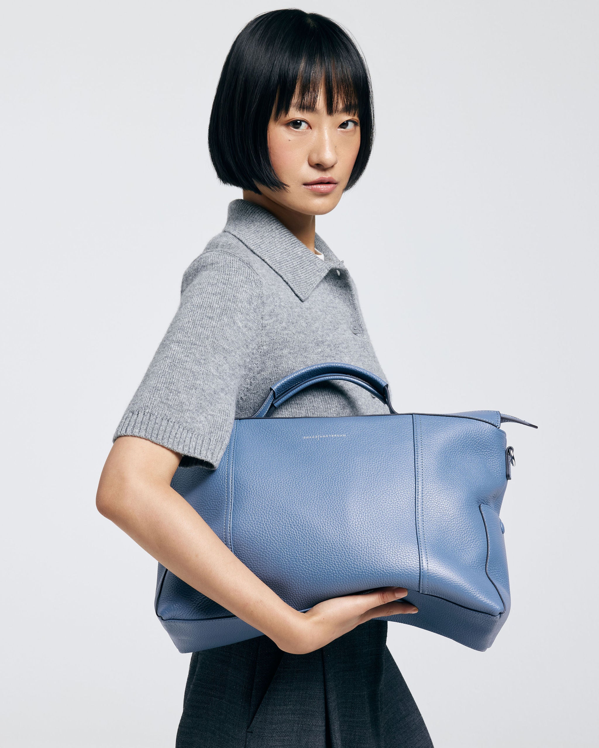 The bag is made of soft supple cowhide leather and is closed at the top with zipper.