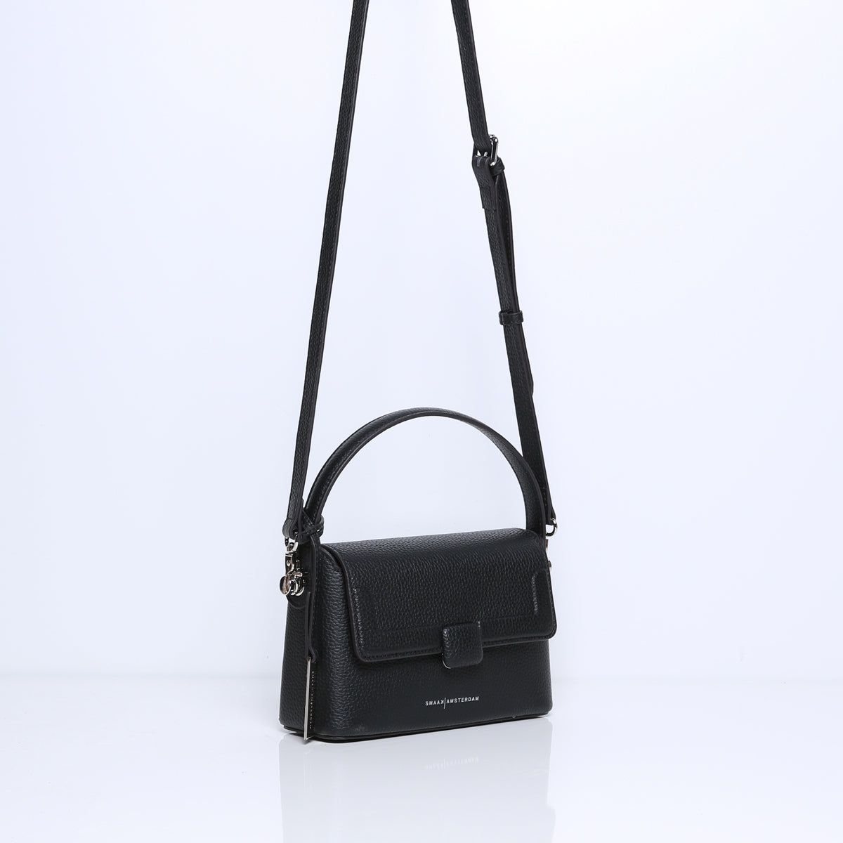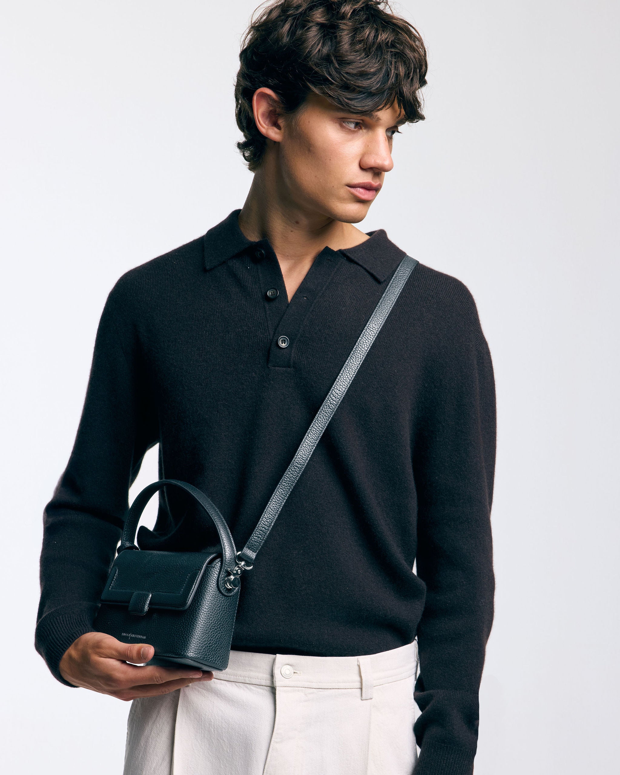 The ALAN has a short handle which can be set back and a detachable leather crossbody strap. The handbag opens at the front with a magnetic closure. There is enough room for all your essentials such as a phone, wallet, (sun)glasses and keys. The rectangular and open shape allows you to easily and conveniently access your belongings.