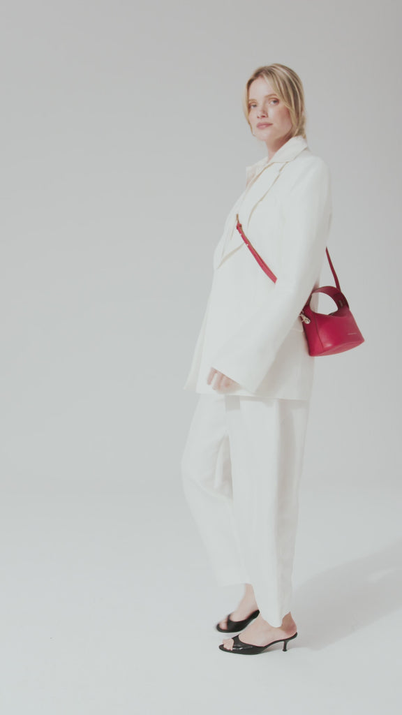 The bag is made of soft and supple cowhide leather. Has no extra inner pocket and is lined with suedine (viscose) material. With the detachable, adjustable shoulder strap, you can also wear this handbag as a crossbody bag.