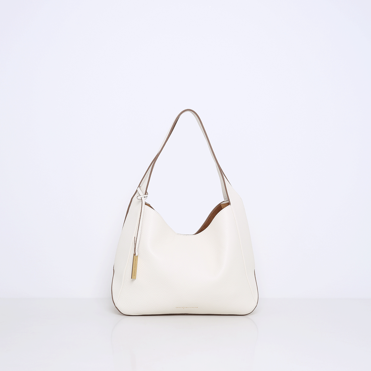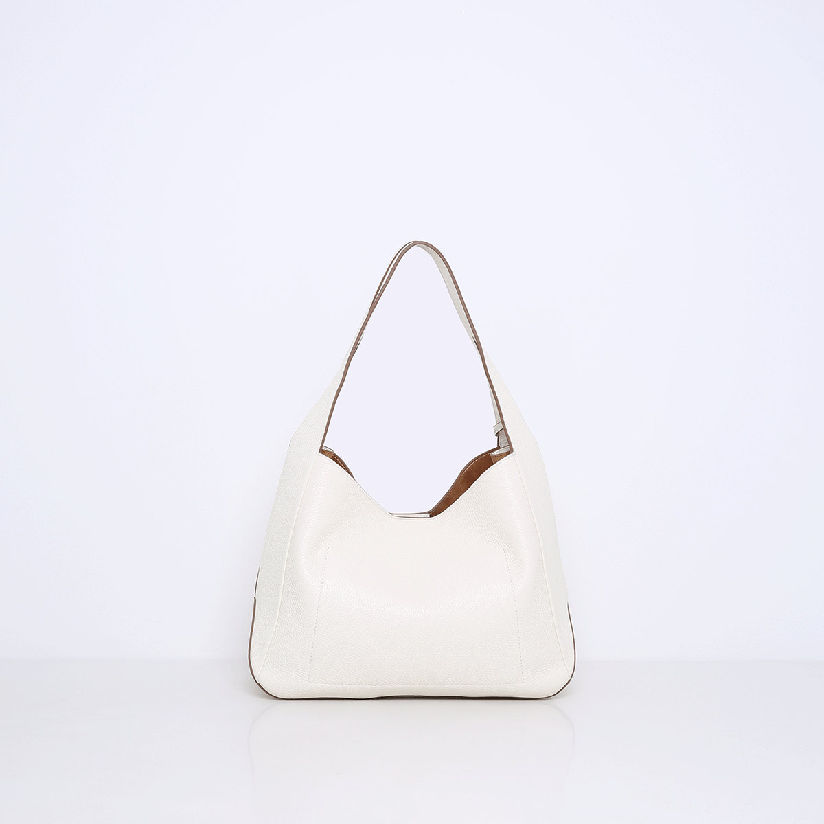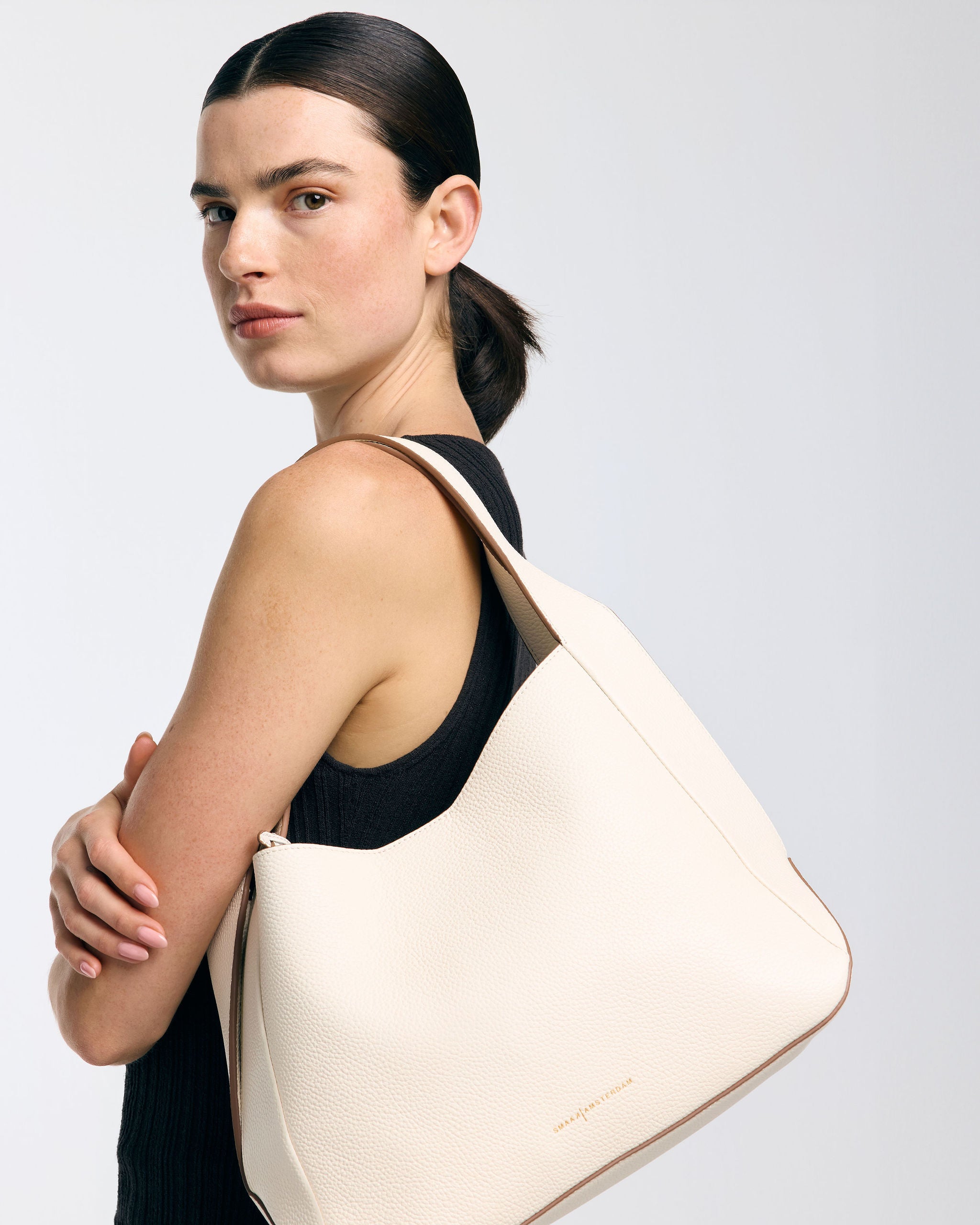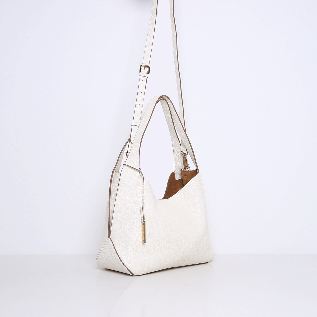 The handbag has two sturdy leather handles that seamlessly transition to the sides of the bag where they end in a stylish split. These splits not only add a sophisticated detail, but also provide extra flexibility and comfort when carrying. This large model is perfect for everyday use, with enough space for all your essentials including a 13 Inch laptop without a sleeve. The bag can be worn either in the hand or crossbody thanks to a detachable and adjustable shoulder strap.