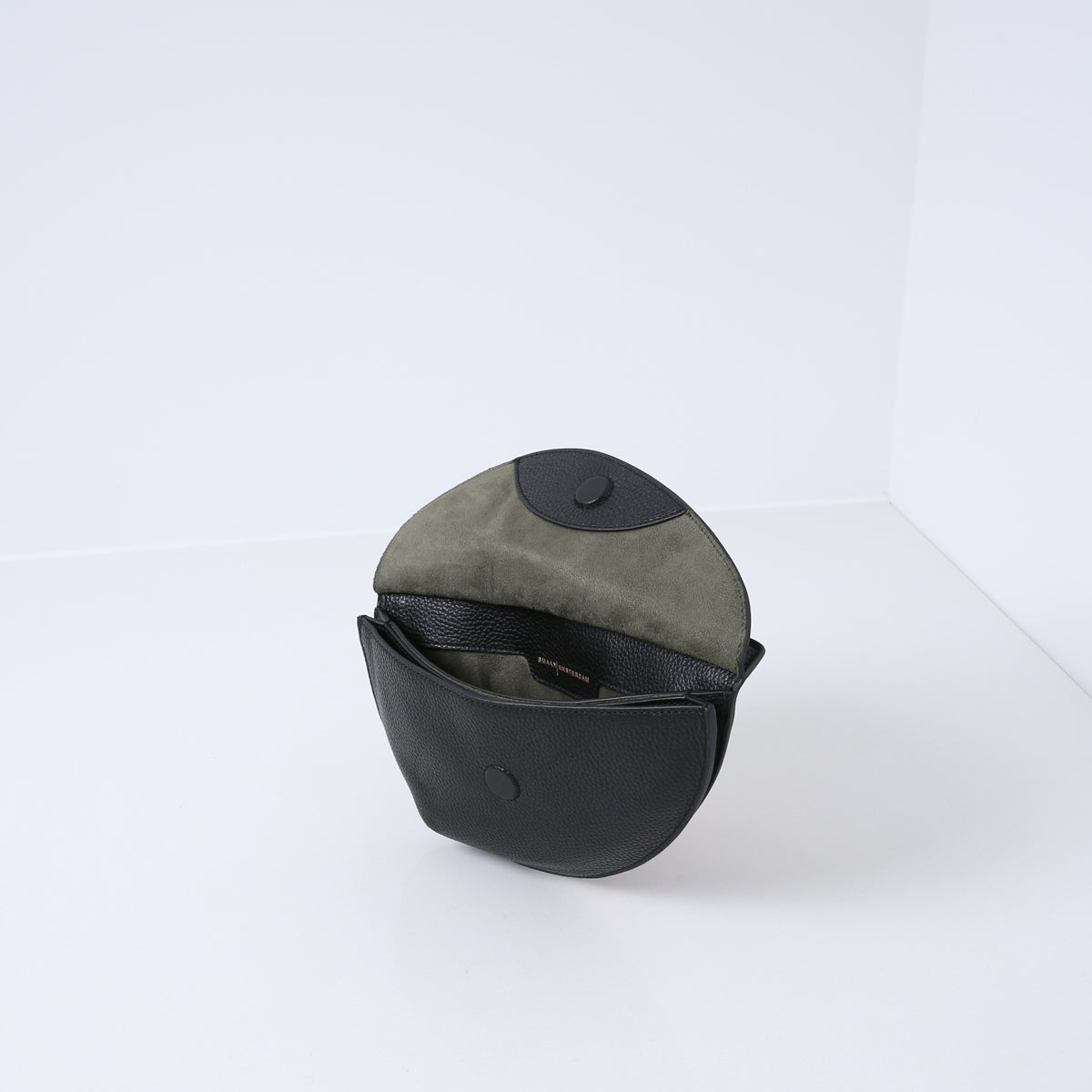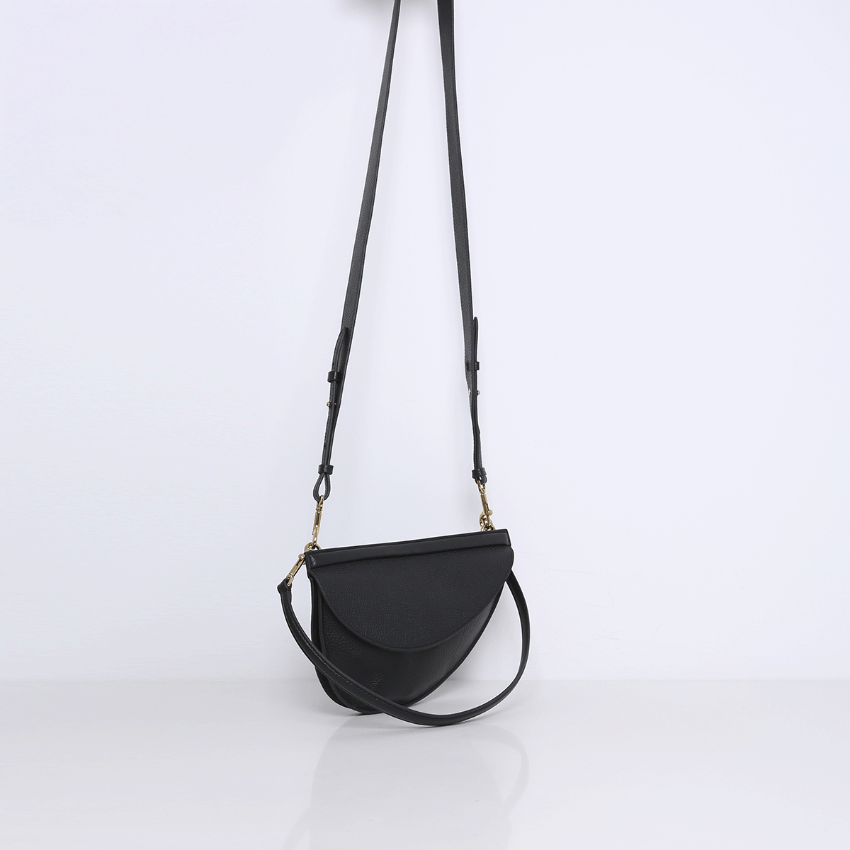 The bag is made of soft supple cowhide leather. Features multiple open interior pockets and is lined with suedine (viscose) material. The closure is finished in the leather via a magnet. On the back, it has an additional zippered pocket. Comes with a short shoulder strap and a long crossbody strap and is adjustable in length.