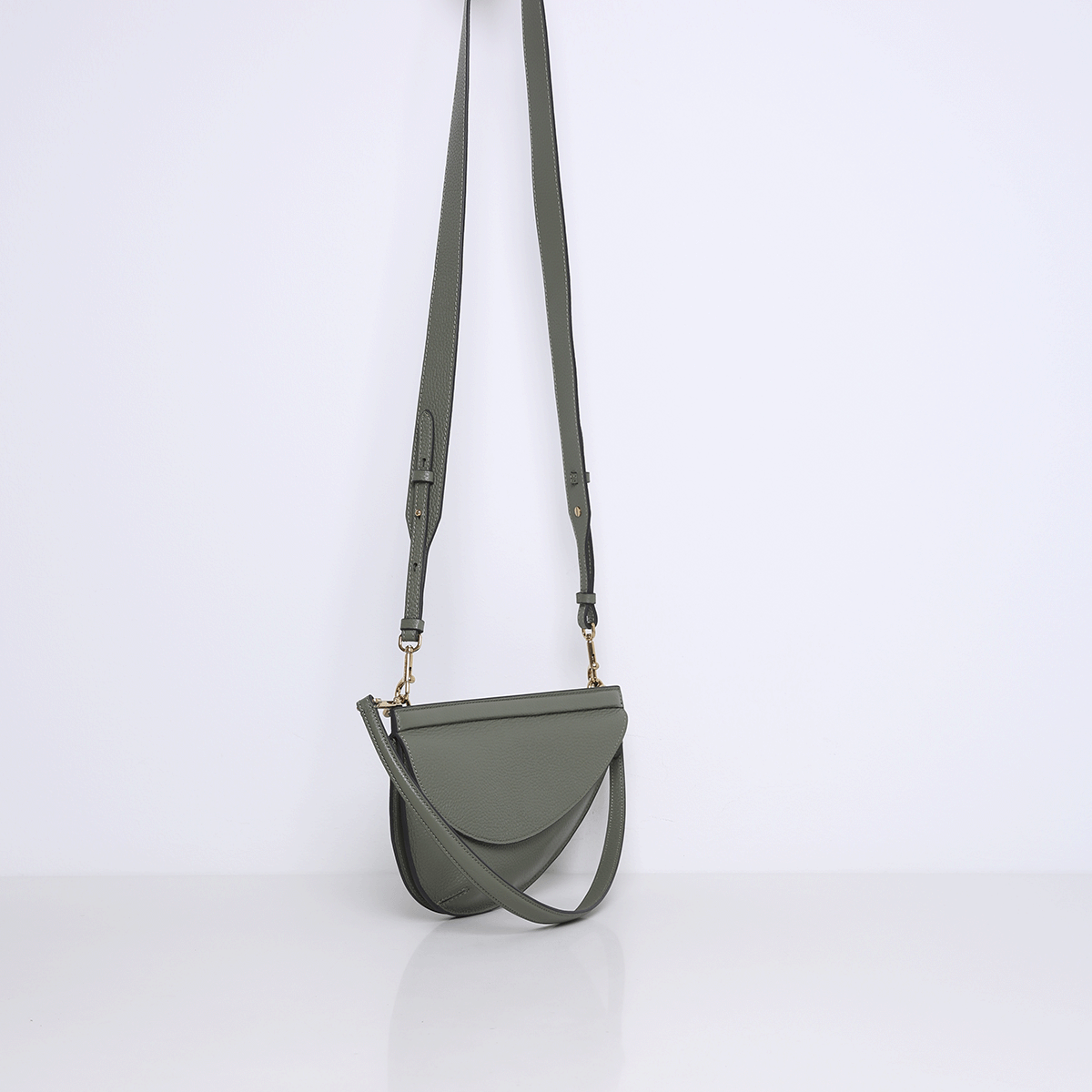 The bag is made of soft supple cowhide leather. Features multiple open interior pockets and is lined with suedine (viscose) material. The closure is finished in the leather via a magnet. On the back, it has an additional zippered pocket. Comes with a short shoulder strap and a long crossbody strap and is adjustable in length.