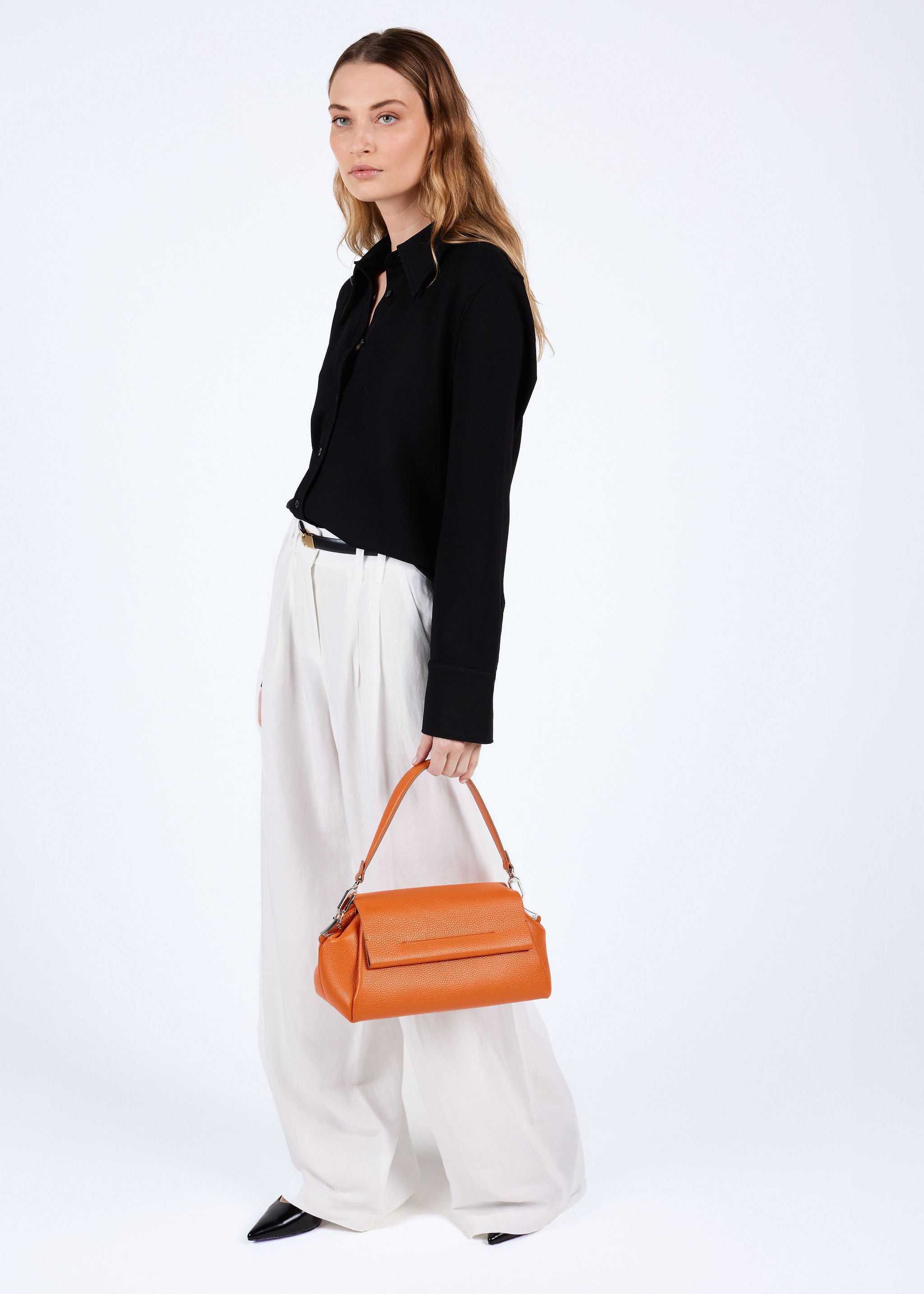 The bag opens through the top with a flap and is closed with a magnetic closure incorporated into the leather. Opening the bag reveals its true functionality. The inside is divided into three compartments, allowing you to keep your belongings organized. Whether you are carrying your phone, wallet, makeup or other daily necessities, there is a dedicated place for everything.