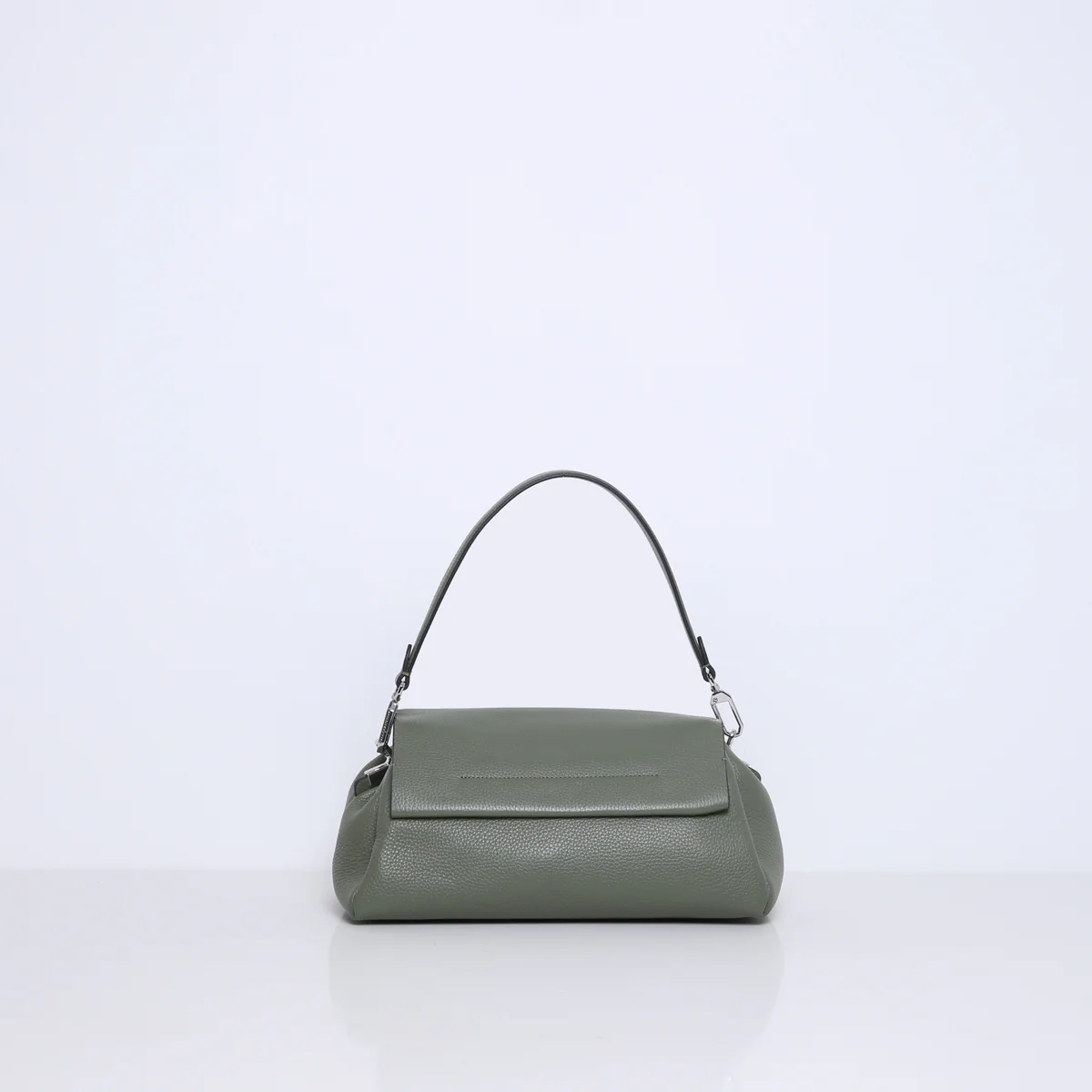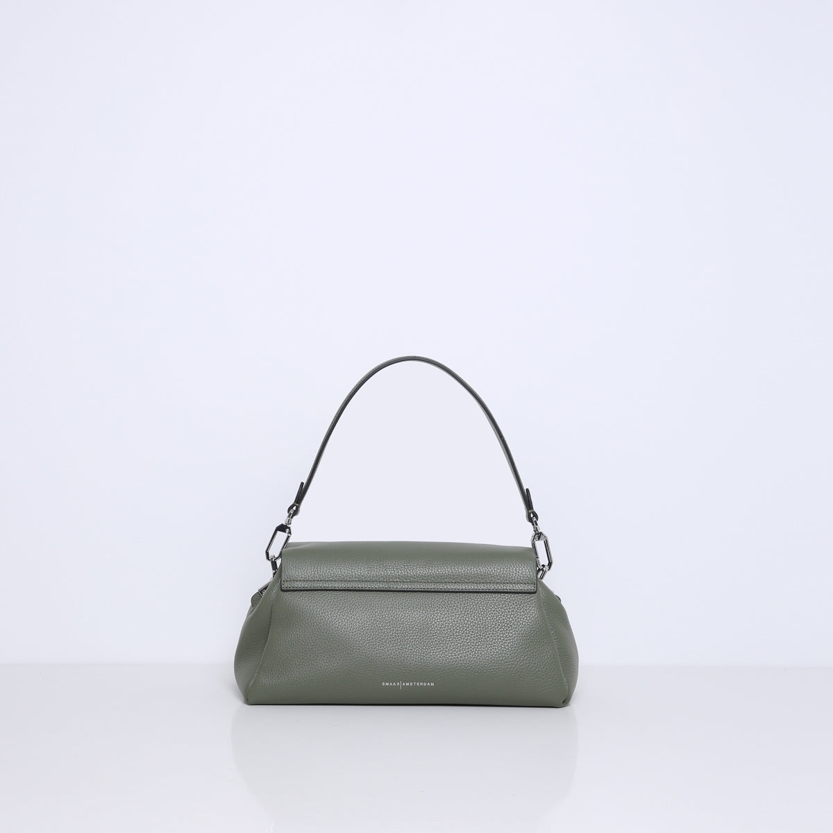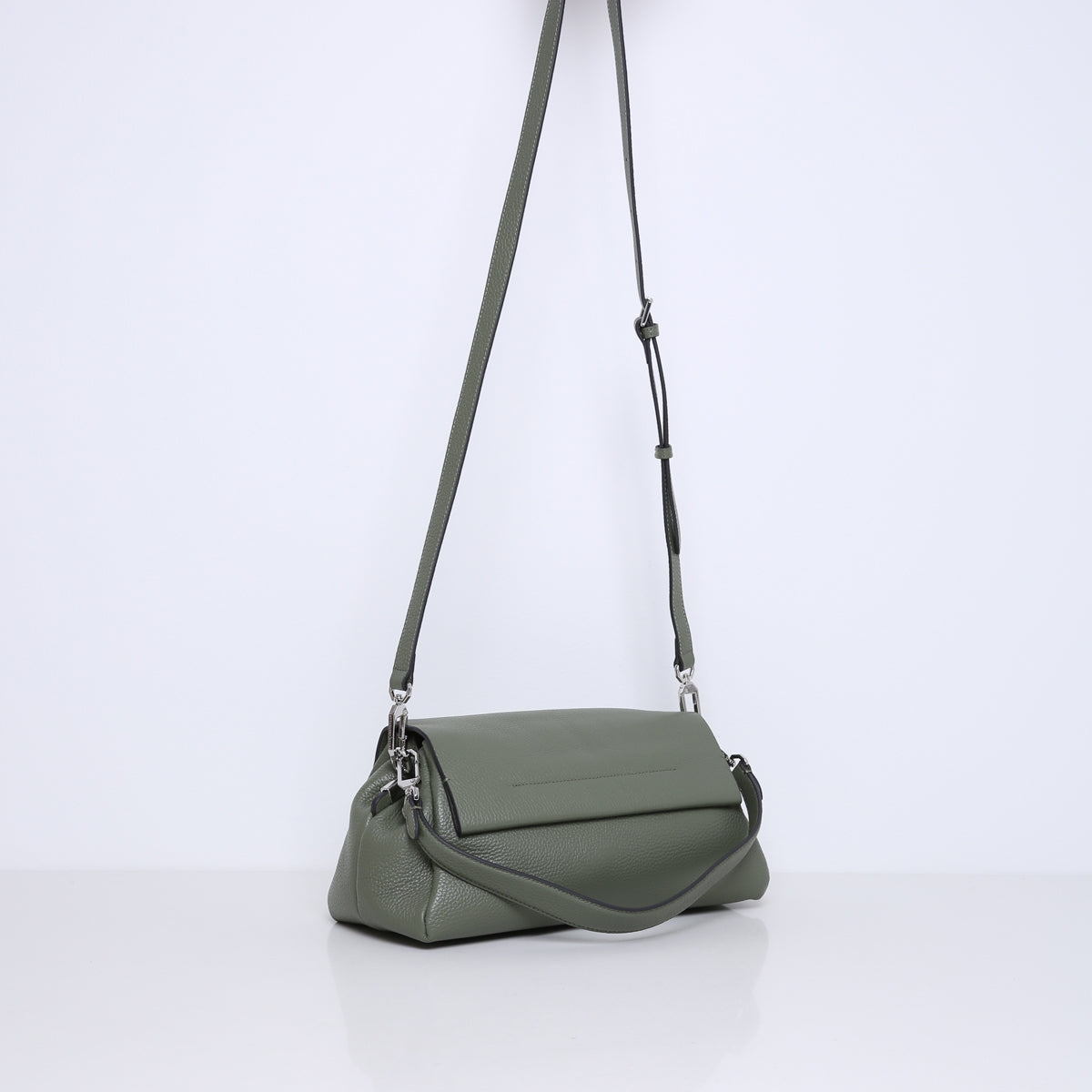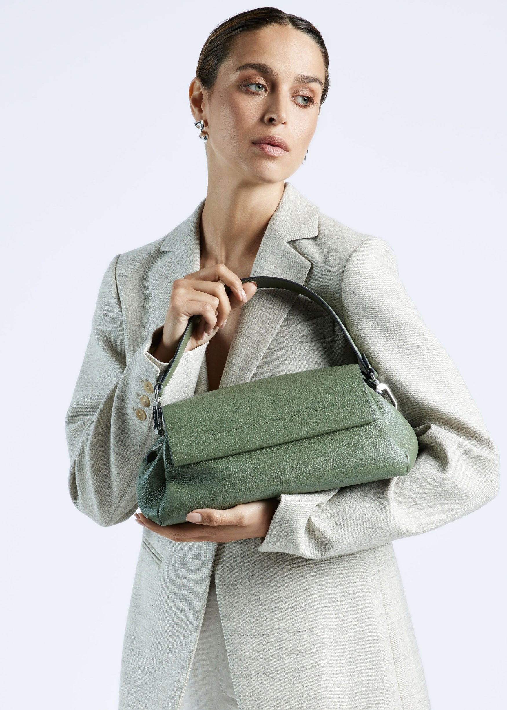 The bag opens through the top with a flap and is closed with a magnetic closure incorporated into the leather. Opening the bag reveals its true functionality. The inside is divided into three compartments, allowing you to keep your belongings organized. Whether you are carrying your phone, wallet, makeup or other daily necessities, there is a dedicated place for everything.