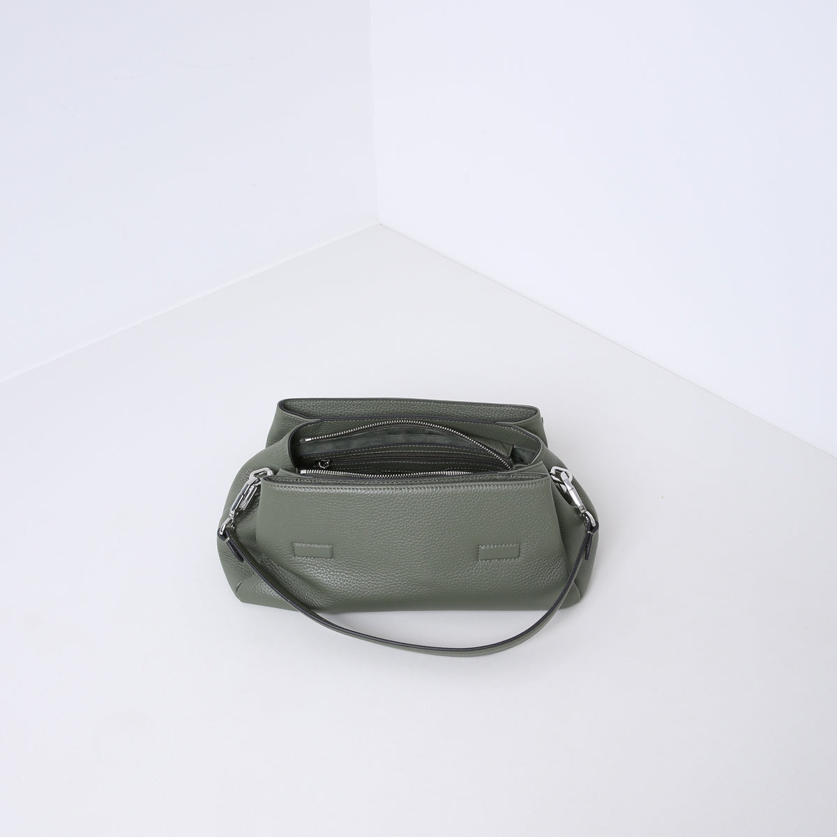 The bag comes with two detachable handles; a short shoulder strap and a long crossbody strap that is adjustable in length. The bag is made of soft and supple cowhide leather lined with suedine (viscose) material.