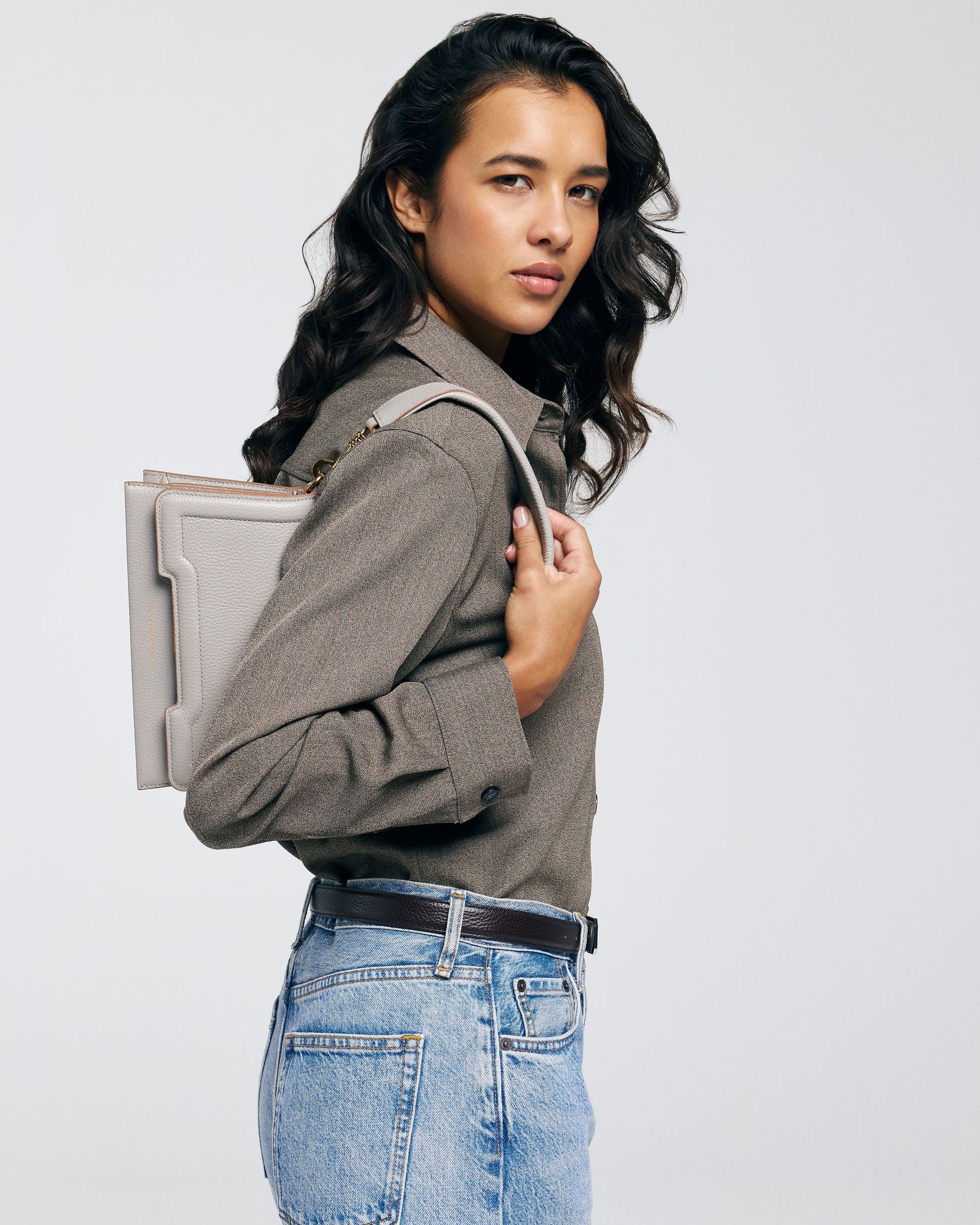 The design has a fine grip and nice details on the shoulder strap. Unique to the design is the arrangement of compartments inspired by an accordion.