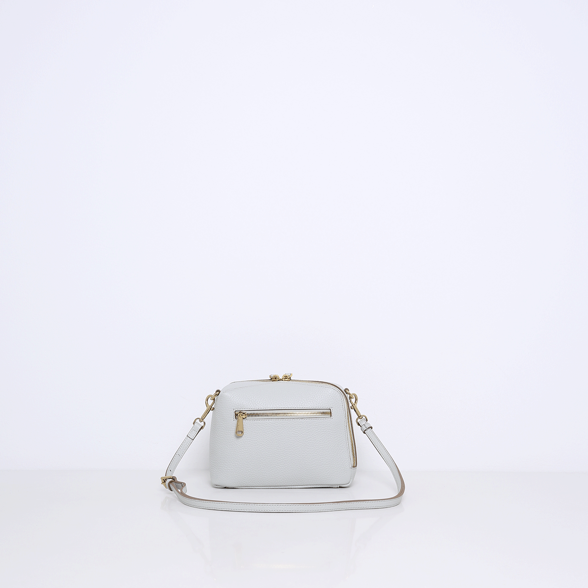 The bag has a short fabric shoulder strap with a length of 65 cm and a long leather crossbody strap adjustable to 120 cm.