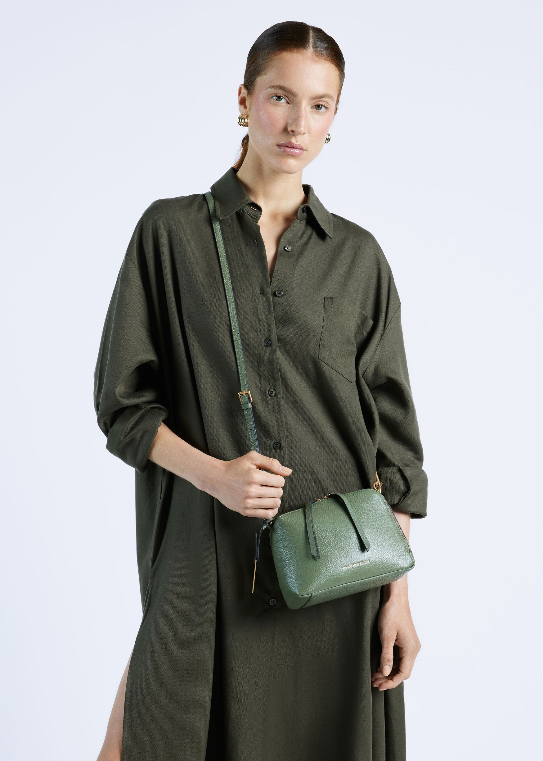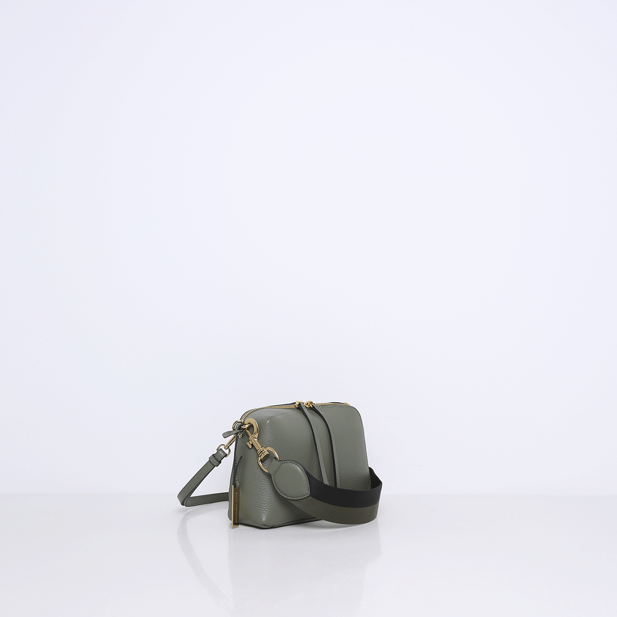 The bag has a short fabric shoulder strap with a length of 65 cm and a long leather crossbody strap adjustable to 120 cm.
