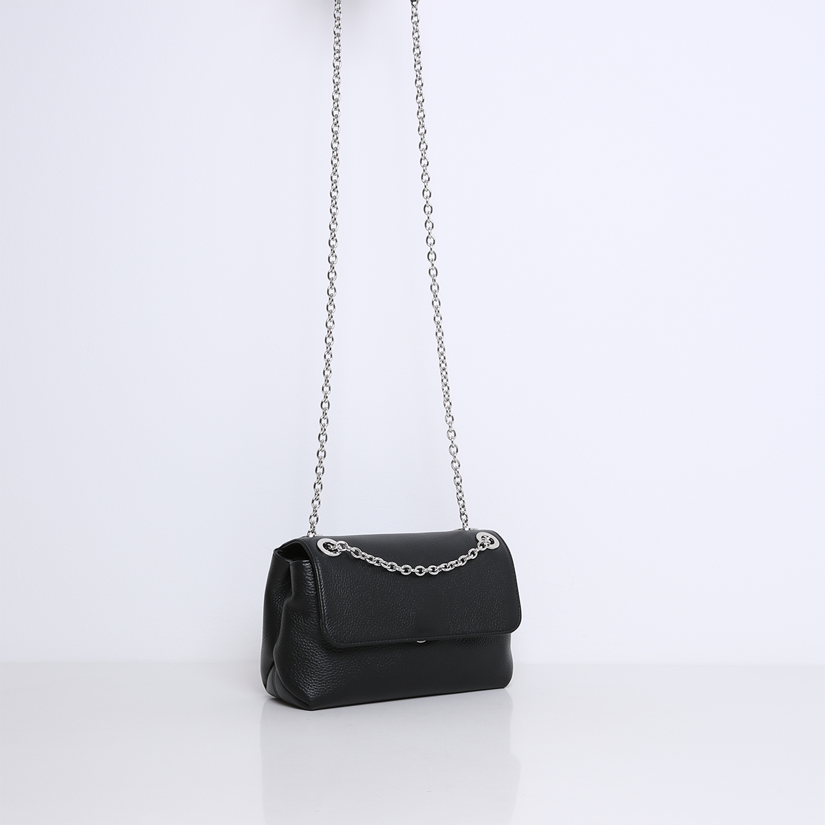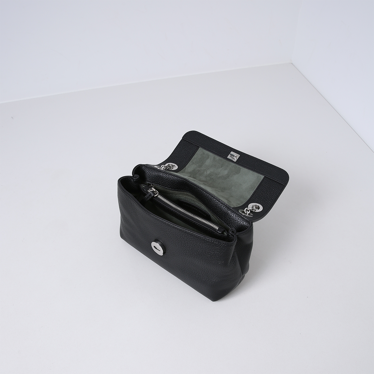 The bag has two compartments on the inside, separated by a center zippered pocket. It also features several interior pockets and is lined with suedine (viscose) material. The bag opens on the front and closes with a snap closure. On the center silver hardware chain, the bag is finished with leather, so it can be worn smoothly and comfortably on the shoulder. The bag is made of soft and supple leather.