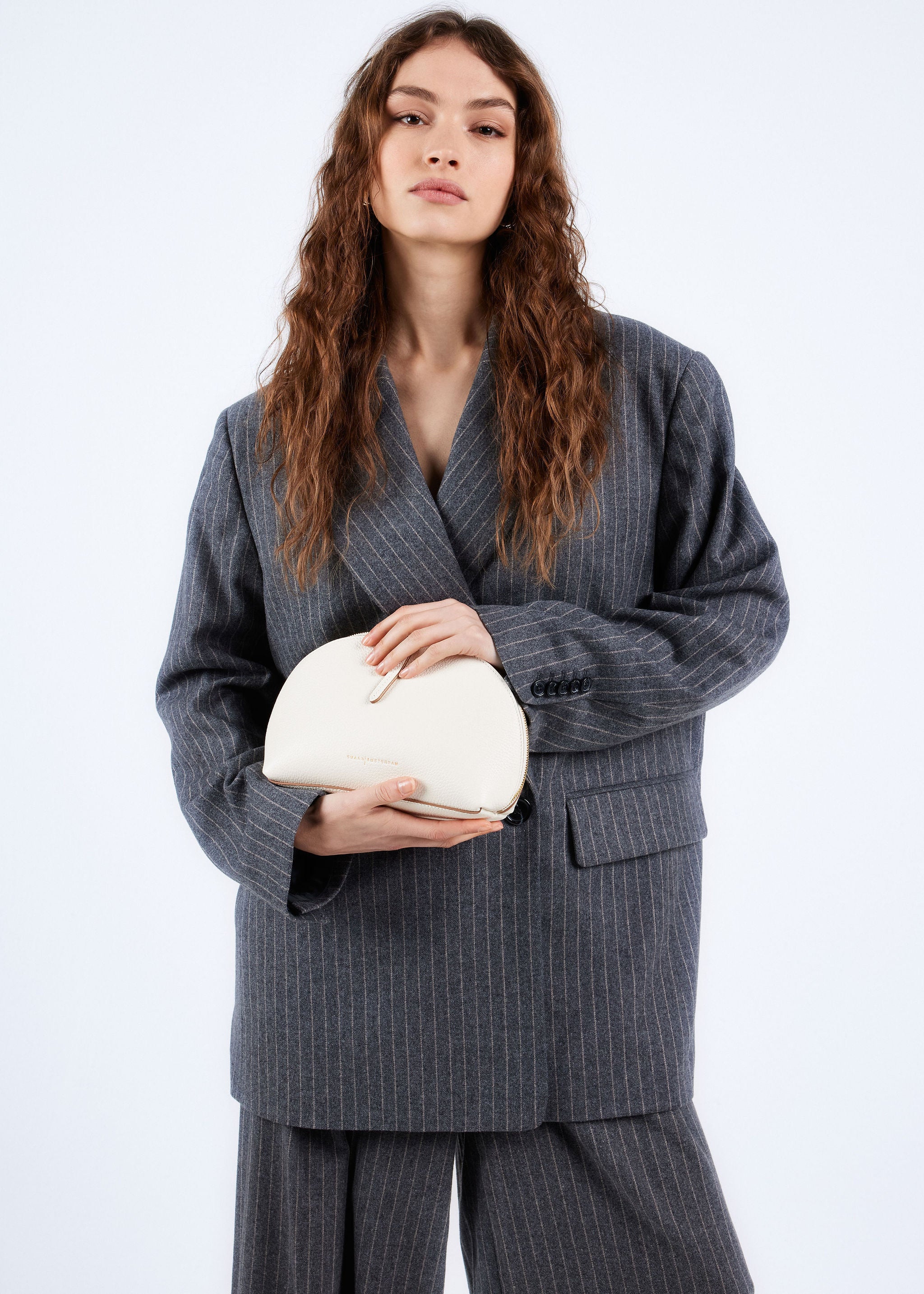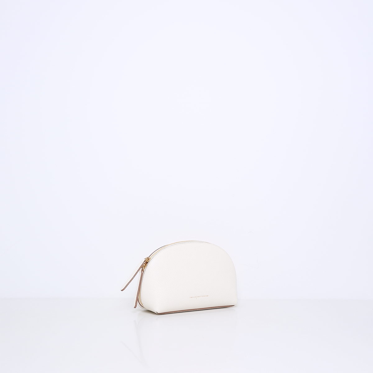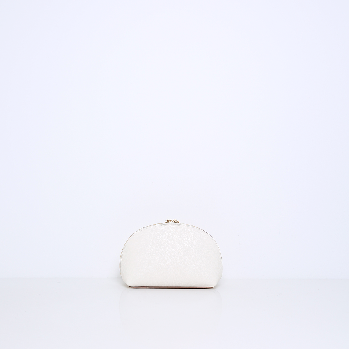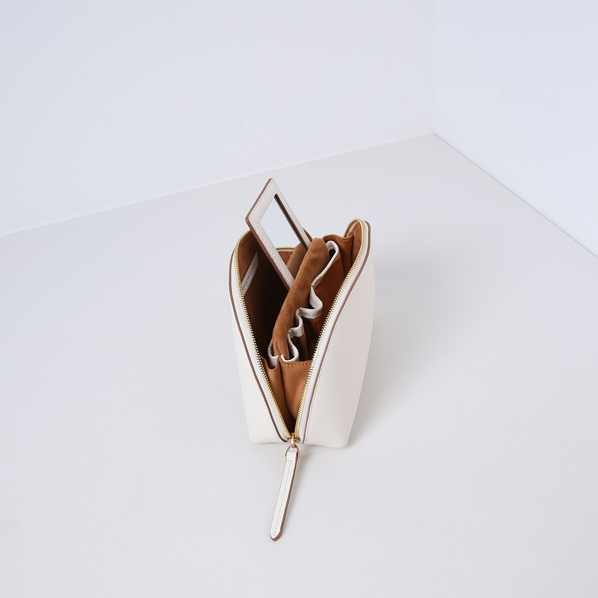 Discover our luxurious leather cosmetic case, designed for versatility and style. This beautiful makeup bag can also serve as a clutch, extra inner bag, or toiletry bag. The interior offers added functionality with separate interior pockets, perfect for storing a mini mirror and separate compartments specifically for lipstick, mascara, and other (makeup) belongings. The interior is lined with soft suedine (viscose) material for a luxurious touch and extra protection of your items. The bag has an elegant round/half moon shape and features a zipper closure at the top that opens on both sides for easy access and a chic look. This cosmetic case combines functionality with sophisticated style, ideal for both everyday use and travel.