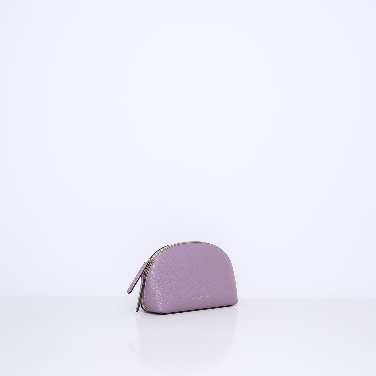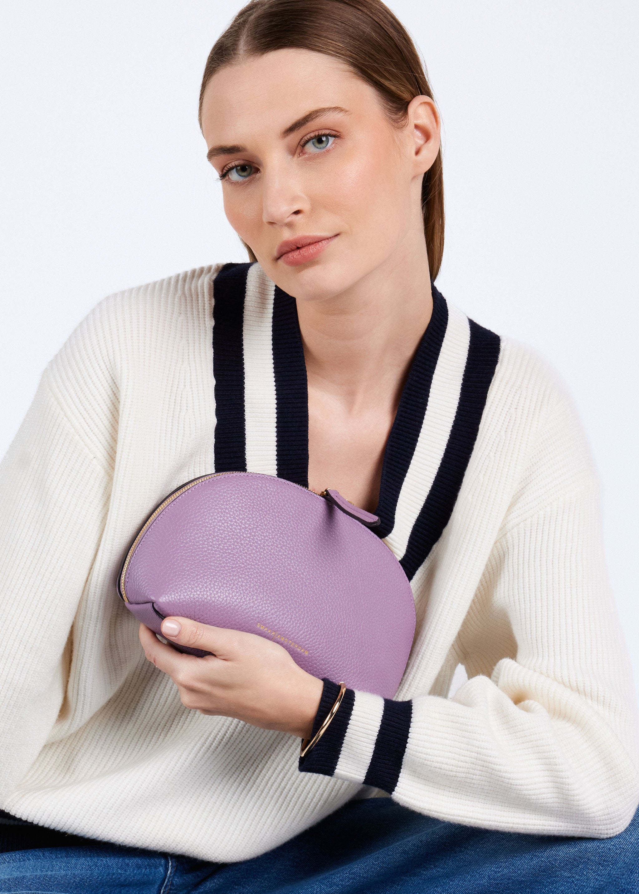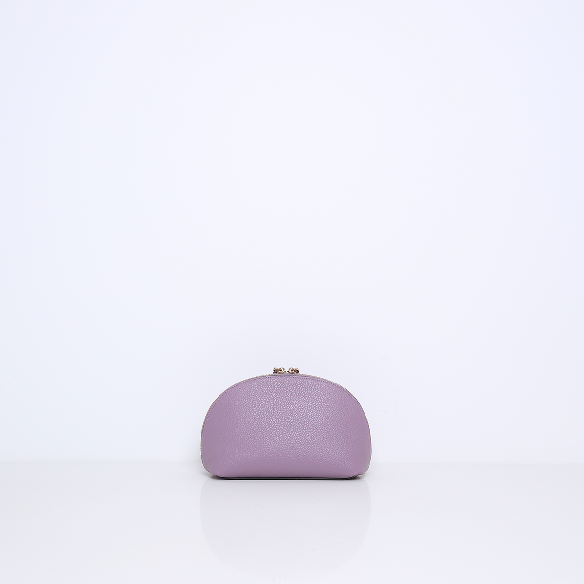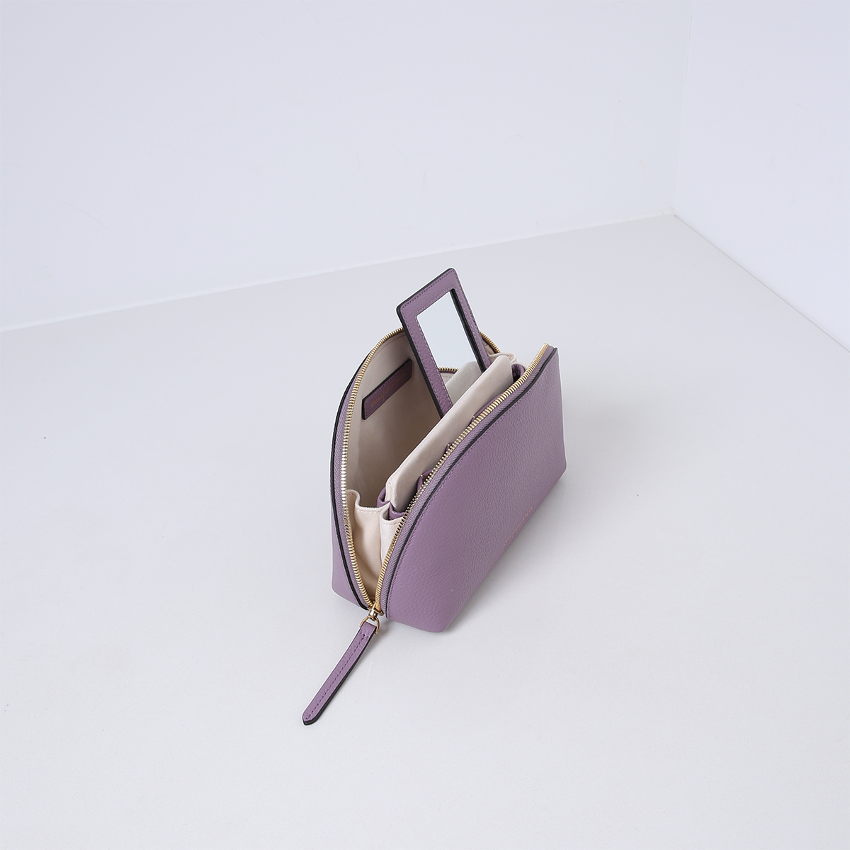 Discover our luxurious leather cosmetic case, designed for versatility and style. This beautiful makeup bag can also serve as a clutch, extra inner bag, or toiletry bag. The interior offers added functionality with separate interior pockets, perfect for storing a mini mirror and separate compartments specifically for lipstick, mascara, and other (makeup) belongings. The interior is lined with soft suedine (viscose) material for a luxurious touch and extra protection of your items. The bag has an elegant round/half moon shape and features a zipper closure at the top that opens on both sides for easy access and a chic look. This cosmetic case combines functionality with sophisticated style, ideal for both everyday use and travel.