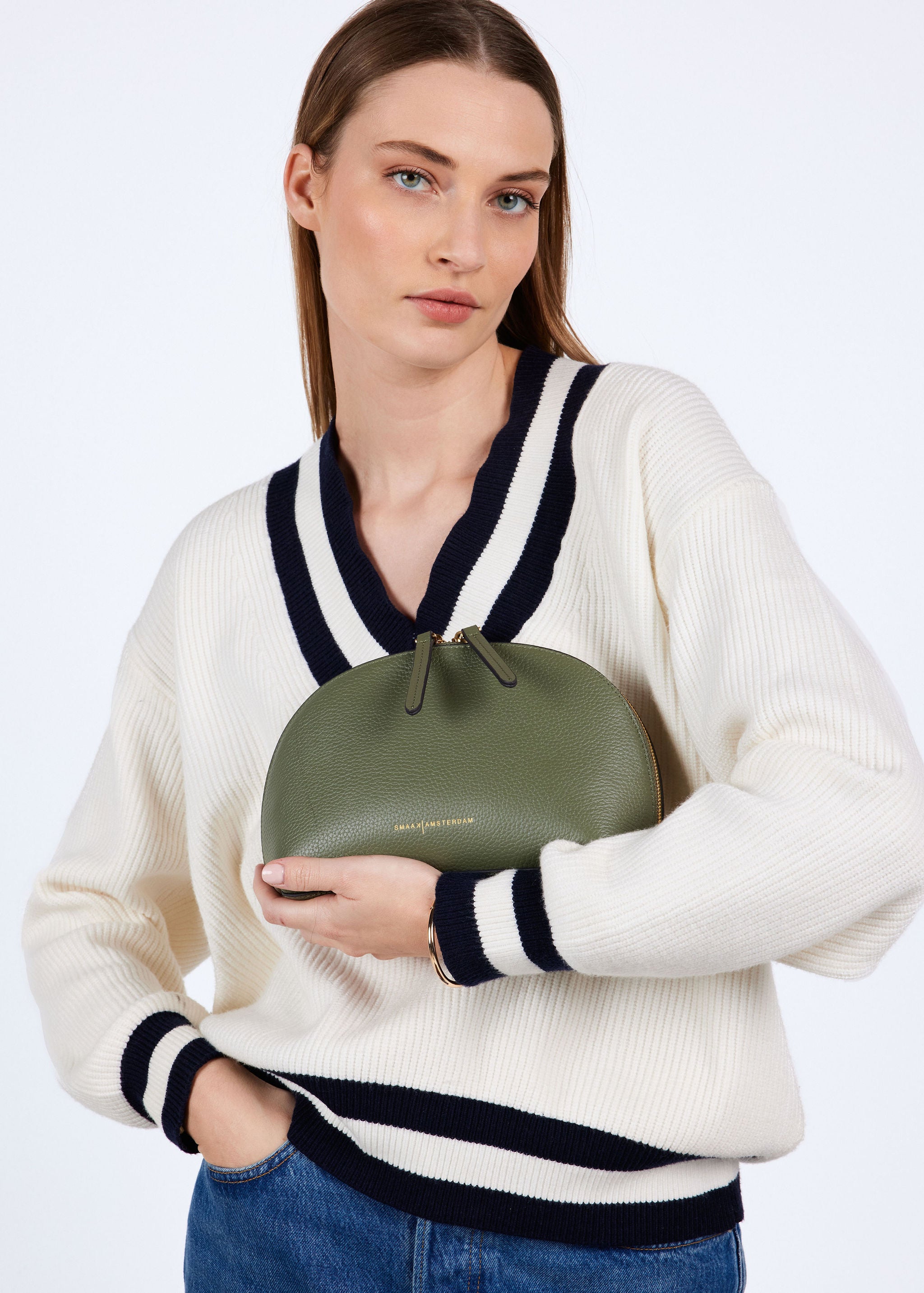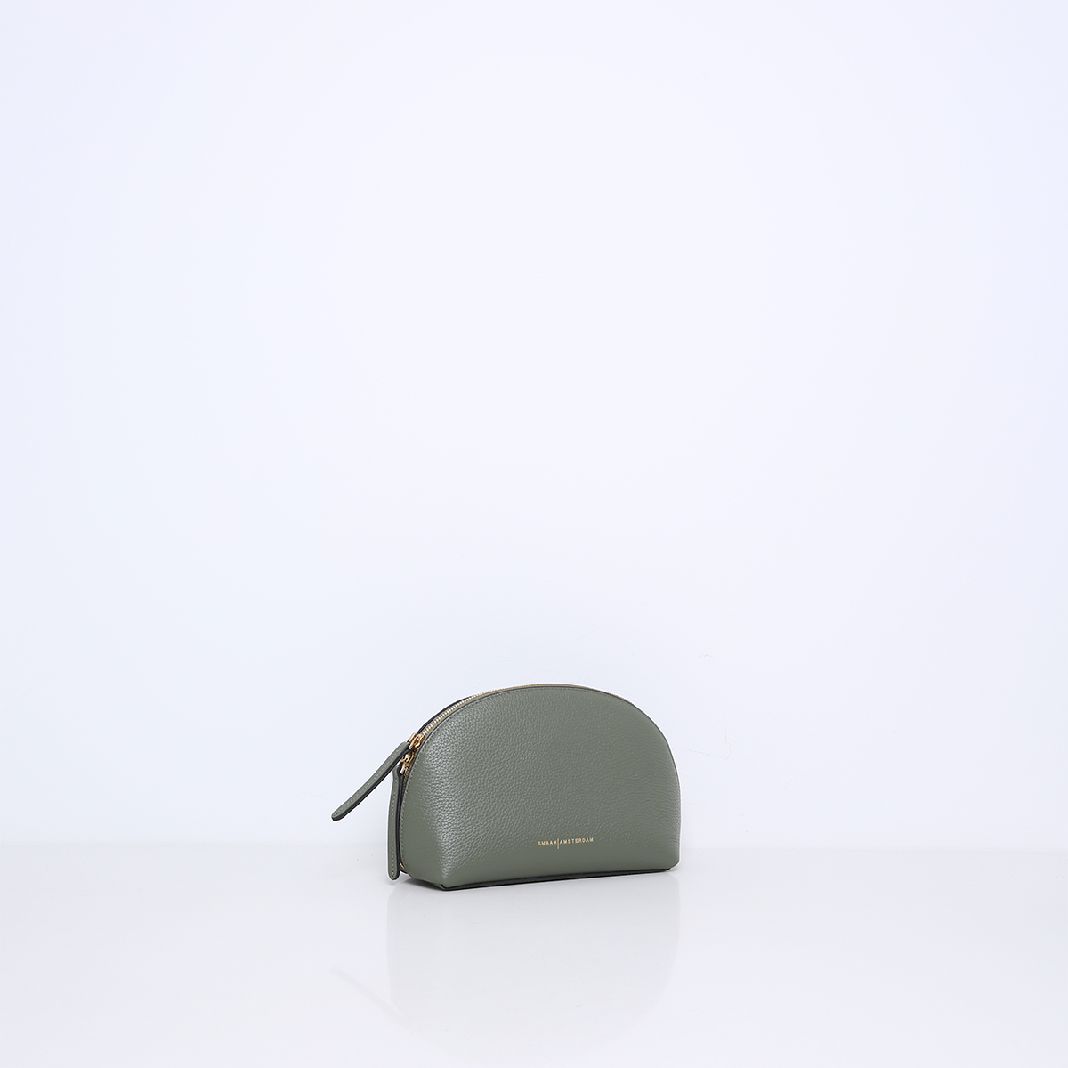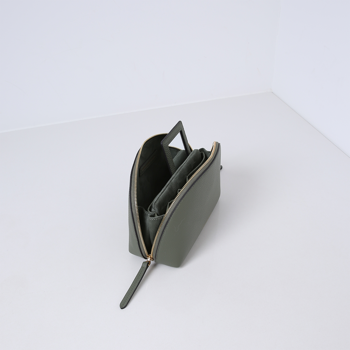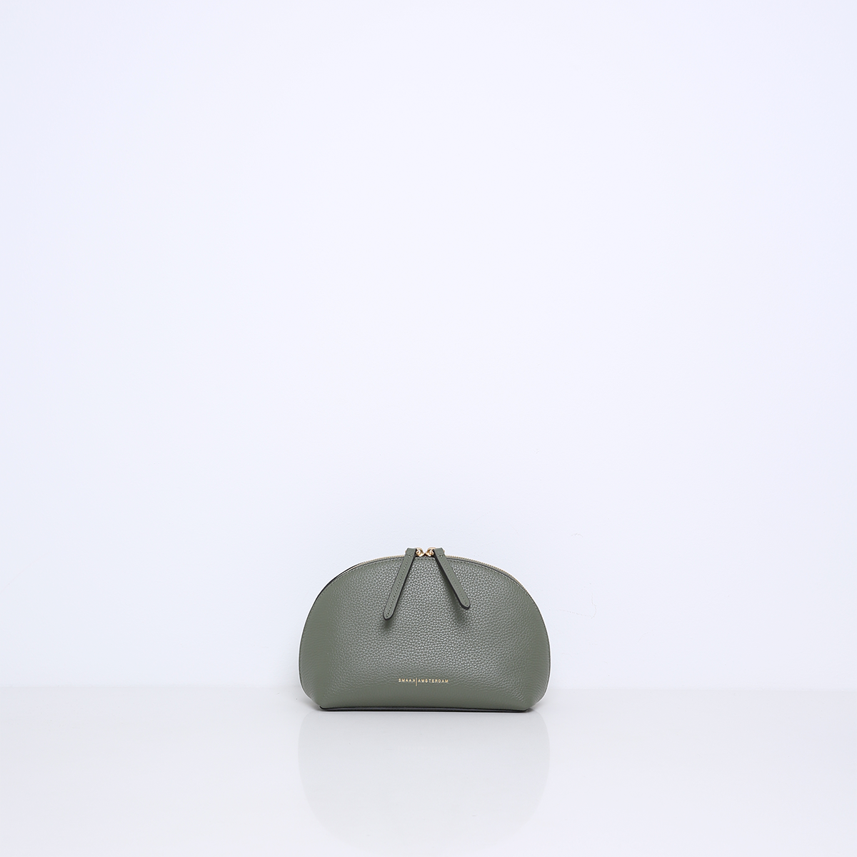Discover our luxurious leather cosmetic case, designed for versatility and style. This beautiful makeup bag can also serve as a clutch, extra inner bag, or toiletry bag. The interior offers added functionality with separate interior pockets, perfect for storing a mini mirror and separate compartments specifically for lipstick, mascara, and other (makeup) belongings. The interior is lined with soft suedine (viscose) material for a luxurious touch and extra protection of your items. The bag has an elegant round/half moon shape and features a zipper closure at the top that opens on both sides for easy access and a chic look. This cosmetic case combines functionality with sophisticated style, ideal for both everyday use and travel.