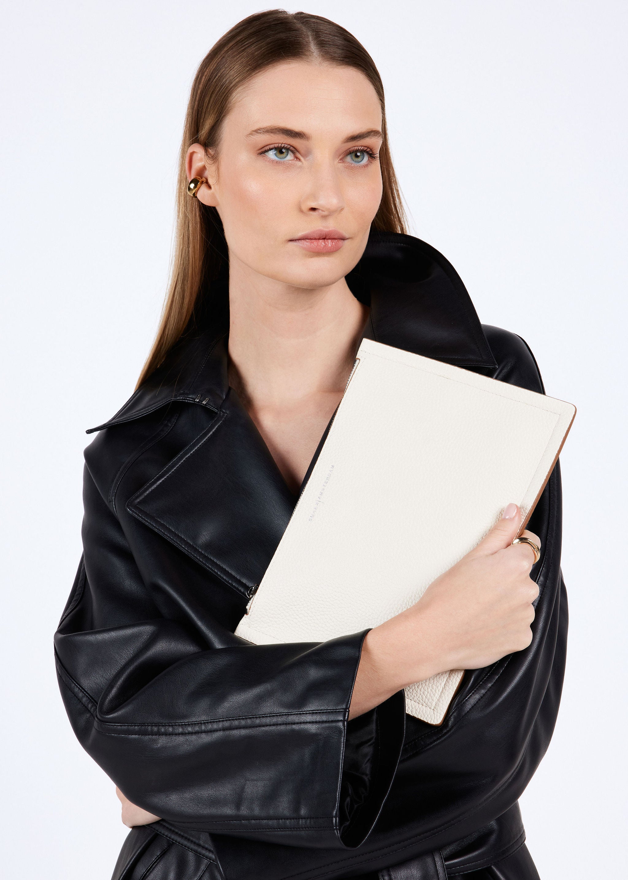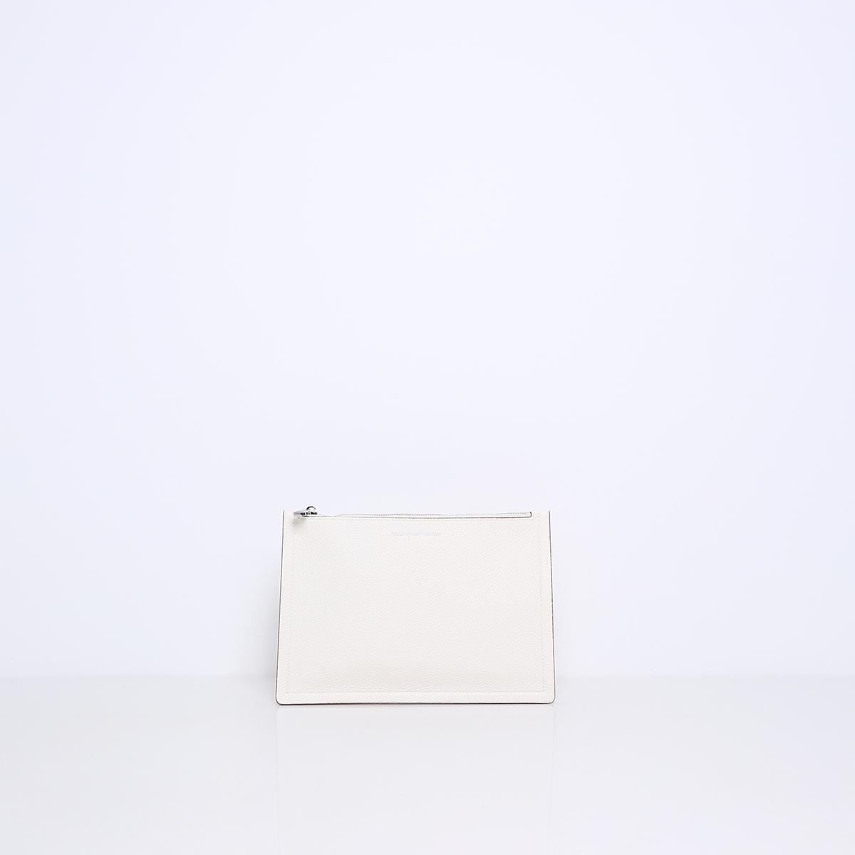 Discover our versatile leather pouch, perfect to use as a clutch or as an extra inner bag. This stylish pouch has no extra interior pockets, keeping it wonderfully spacious and simple. The inside is lined with luxurious suedine (viscose) material, providing a soft touch and extra protection for your belongings. The zipper at the top ensures everything is securely stored. Thanks to its flat design, this pouch fits easily into larger bags, while as a clutch it is an elegant addition to any outfit.