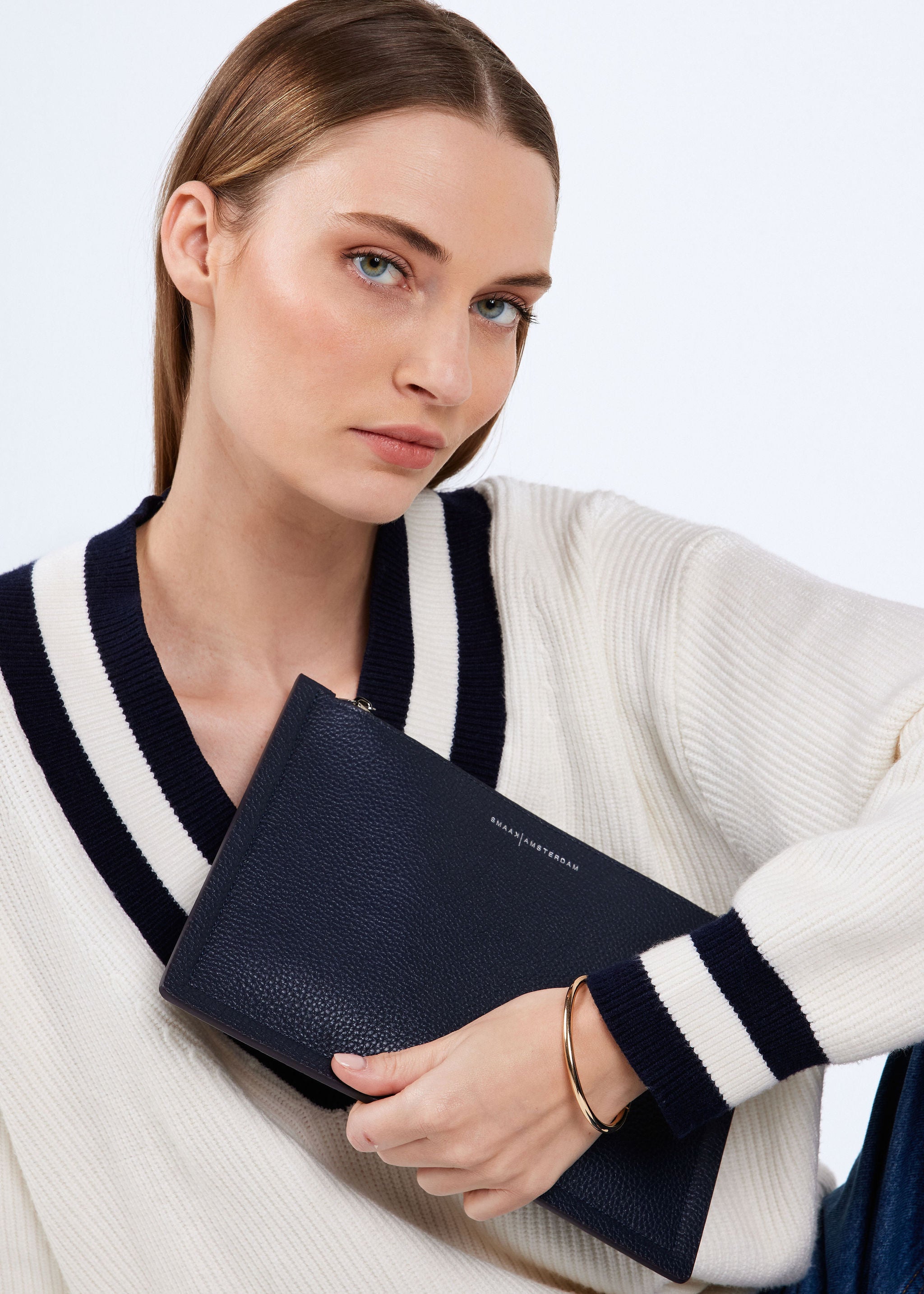 Discover our versatile leather pouch, perfect to use as a clutch or as an extra inner bag. This stylish pouch has no extra interior pockets, keeping it wonderfully spacious and simple. The inside is lined with luxurious suedine (viscose) material, providing a soft touch and extra protection for your belongings. The zipper at the top ensures everything is securely stored. Thanks to its flat design, this pouch fits easily into larger bags, while as a clutch it is an elegant addition to any outfit.