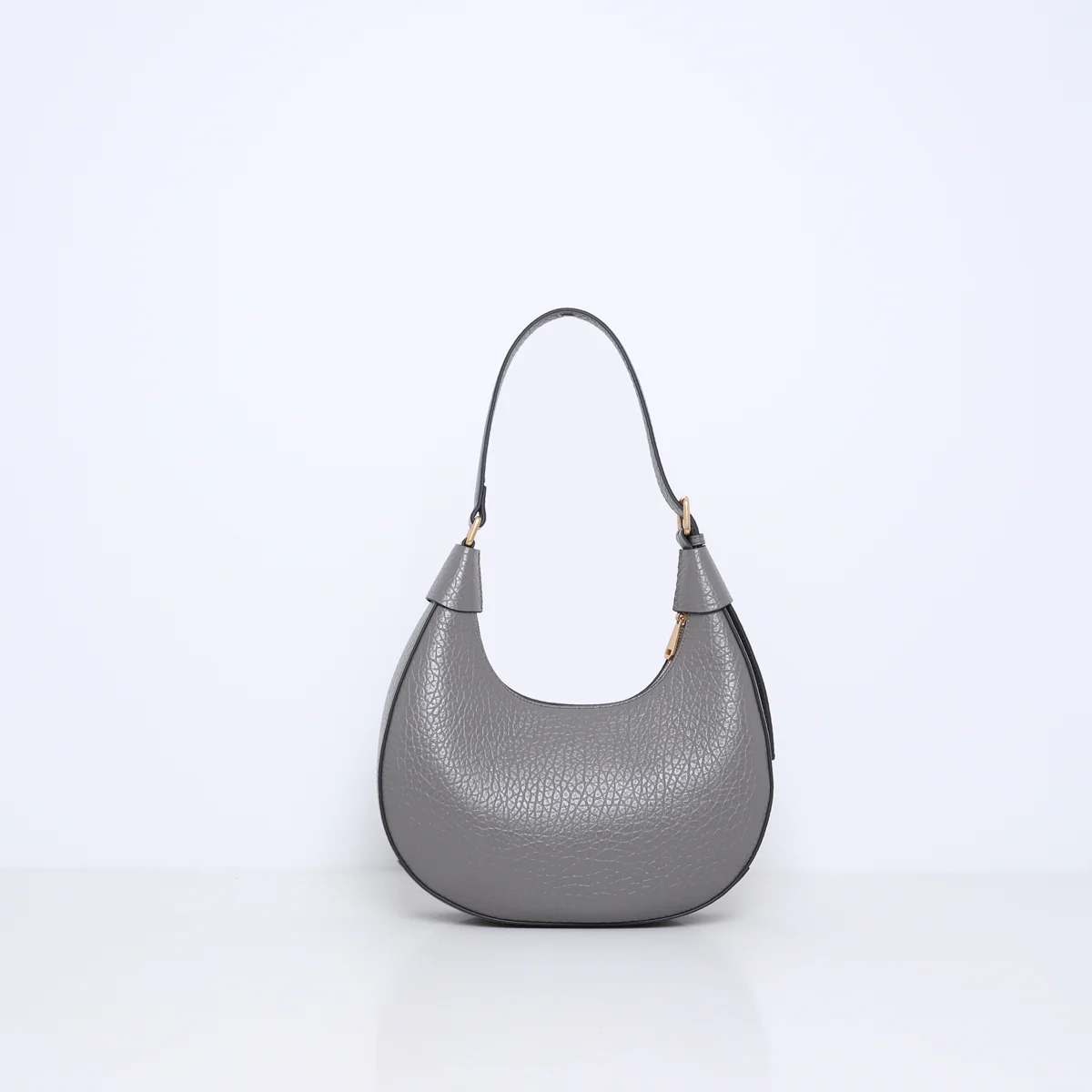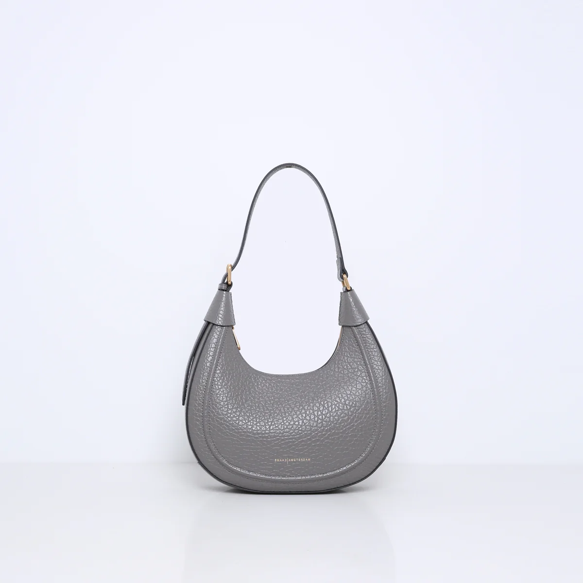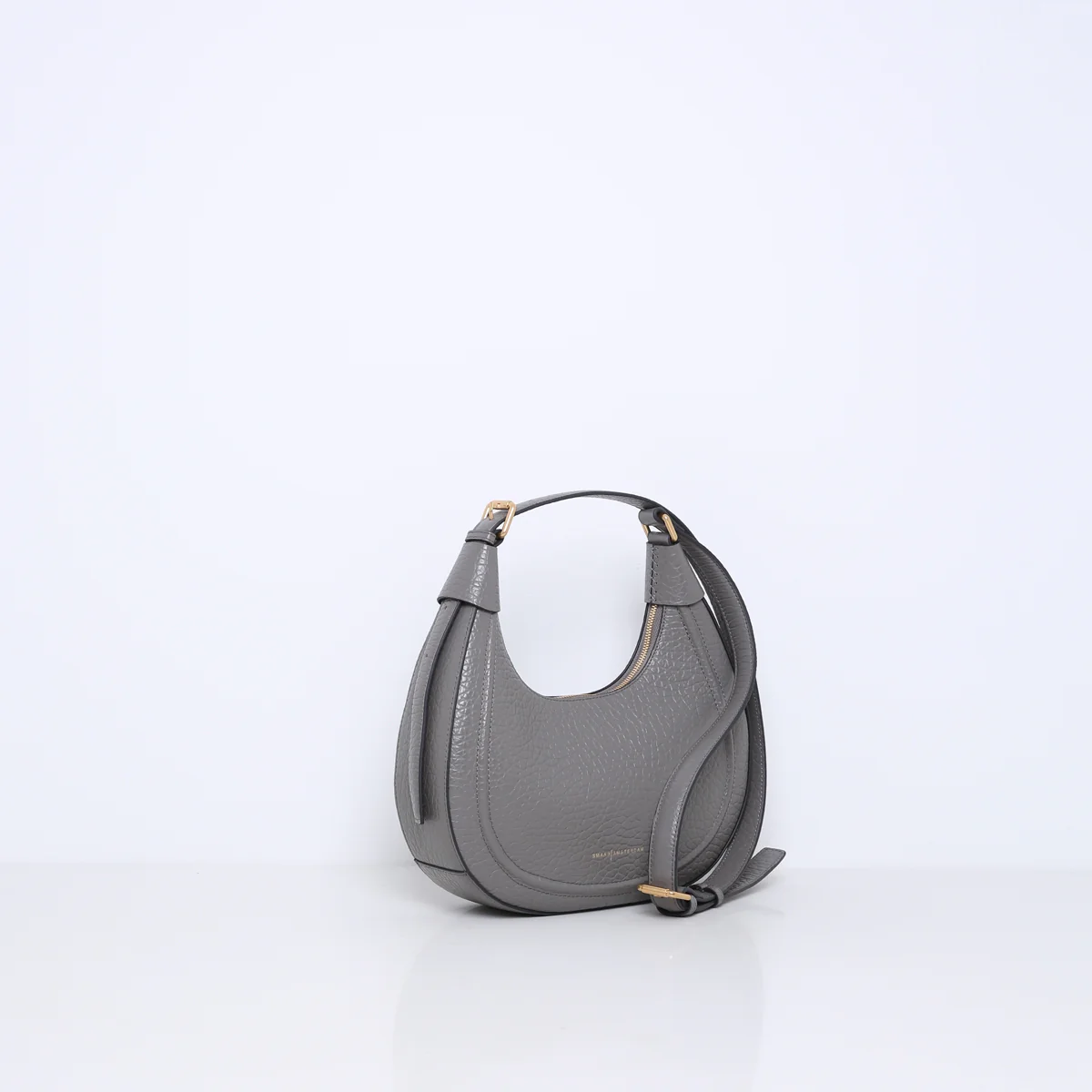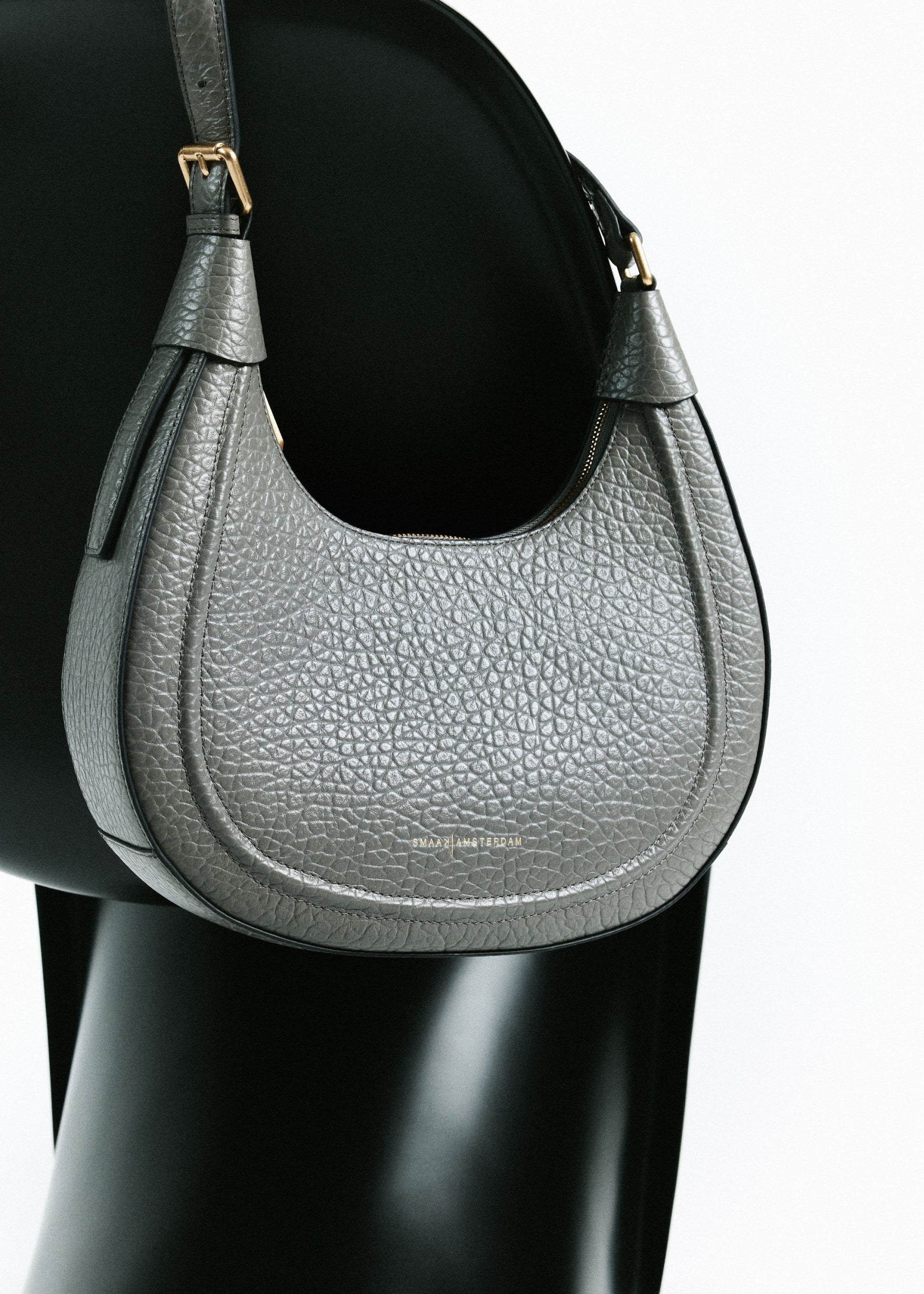 The bag is made of sturdy cowhide leather with an elephant hide embossed pattern. It closes with a top zipper and features a unique strap adjustment feature. To adjust the strap, you'll need to attach or detach the included piece to the bag's buckle. It features multiple interior pockets and is lined with suede (viscose).