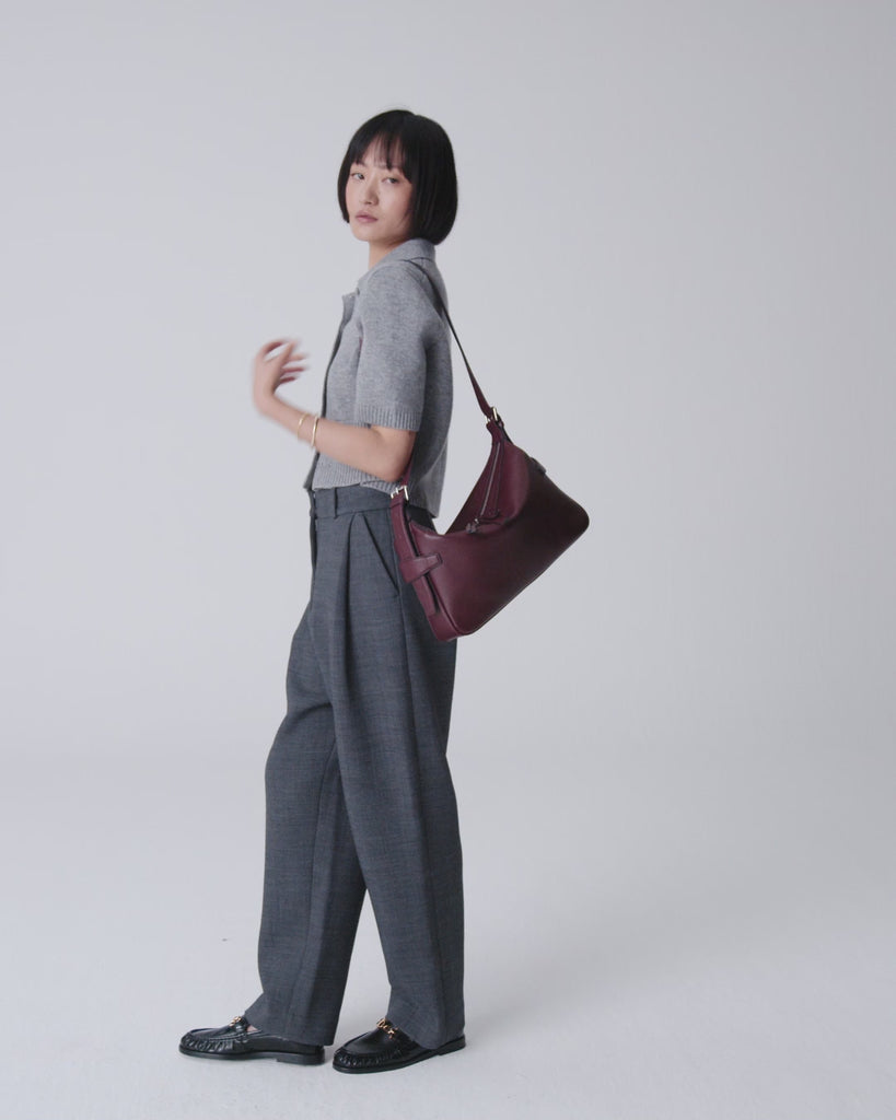 A compact shoulder bag with a soft, modern shape and a casual drape. The slim silhouette fits nicely against the body, making the bag suitable for everyday use.