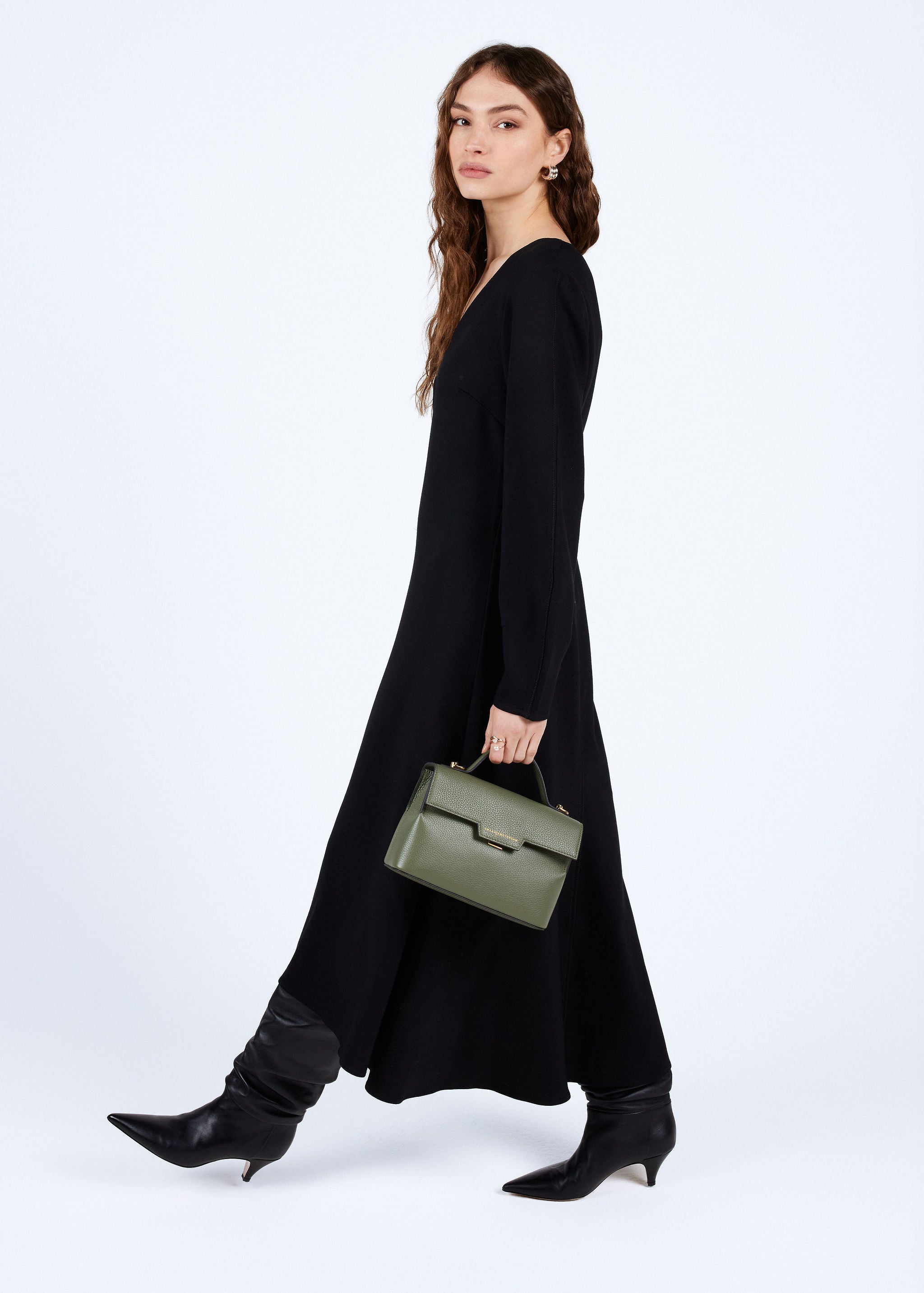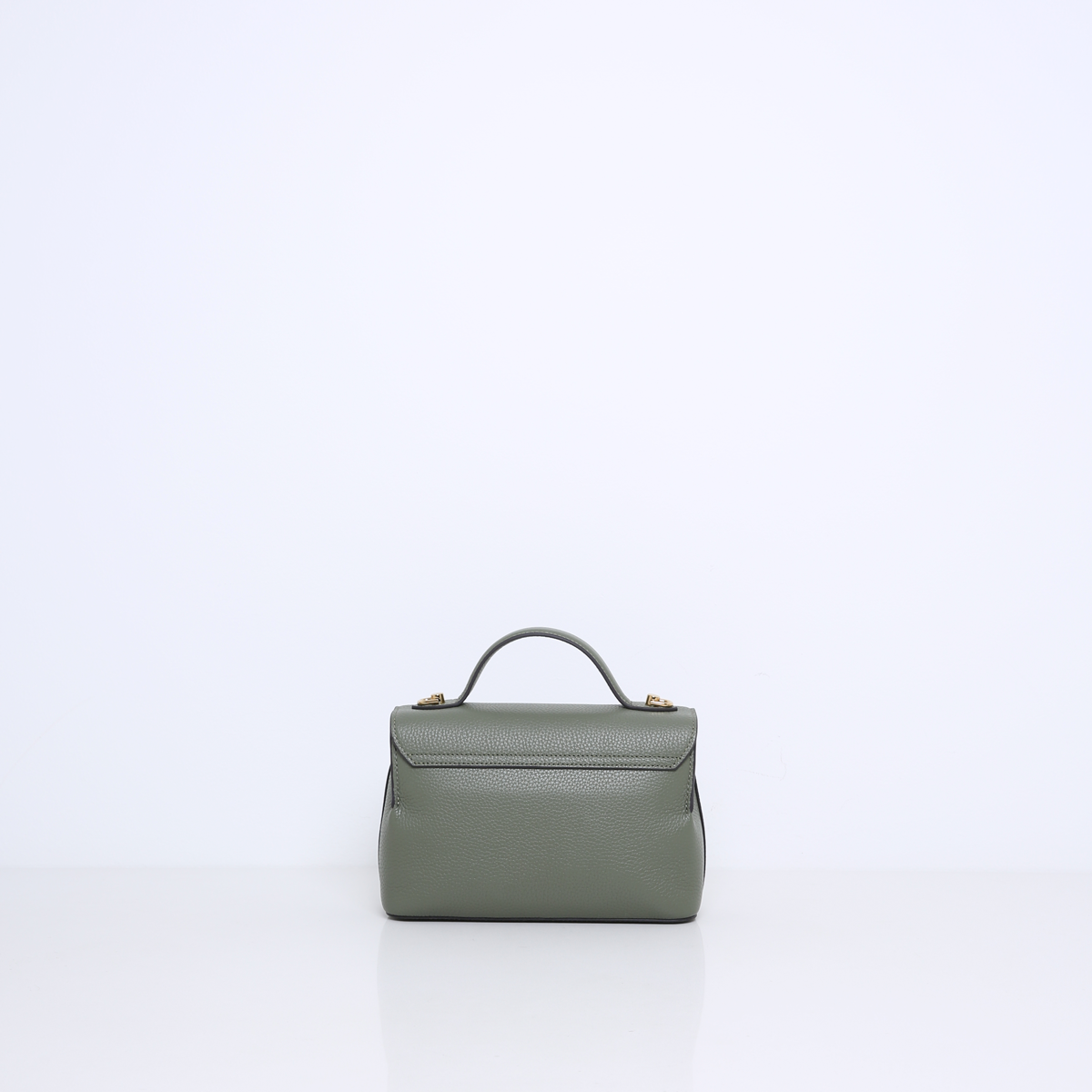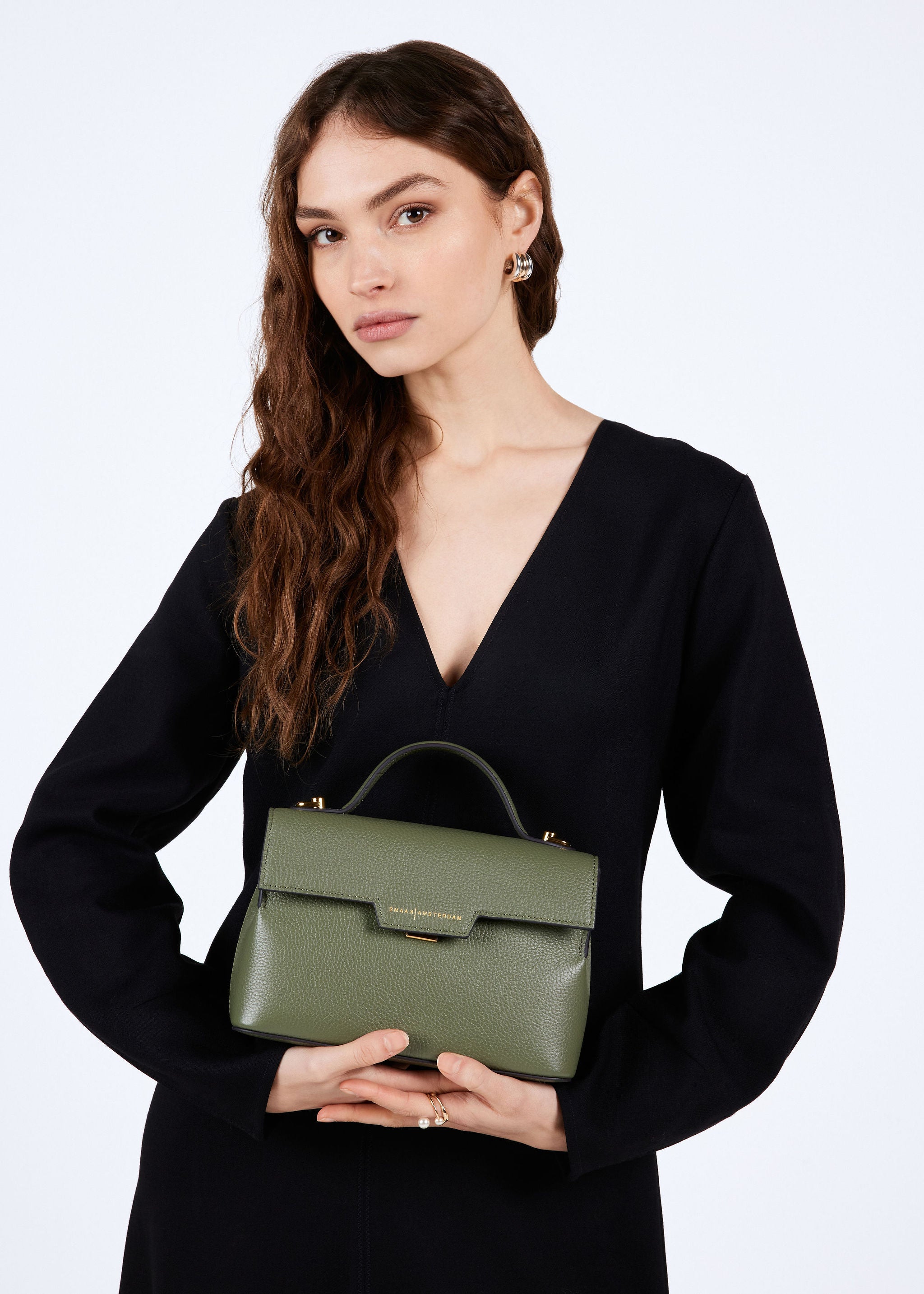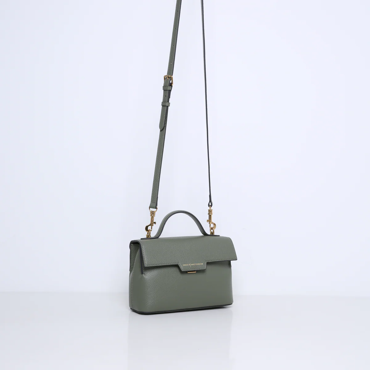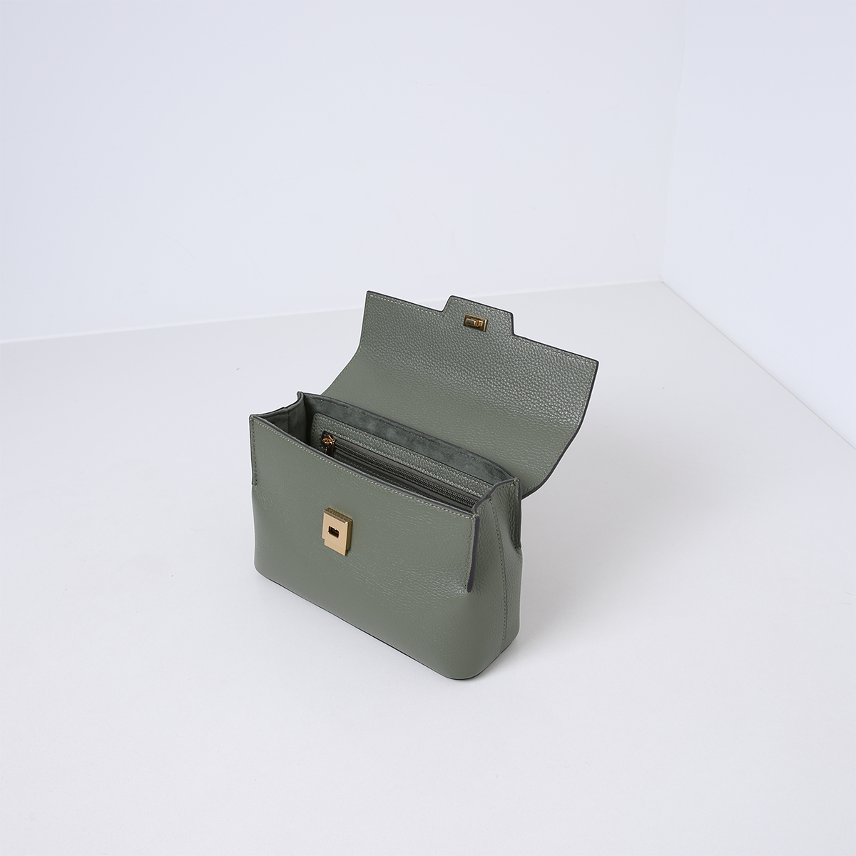 The FLORA has a short handle and a detachable leather crossbody strap that attaches to the top. The handbag opens at the front with a snap closure. There's plenty of room for all your essentials, such as a phone, wallet, (sun)glasses, and keys. Its rectangular, open shape allows for easy and organized access to your belongings.