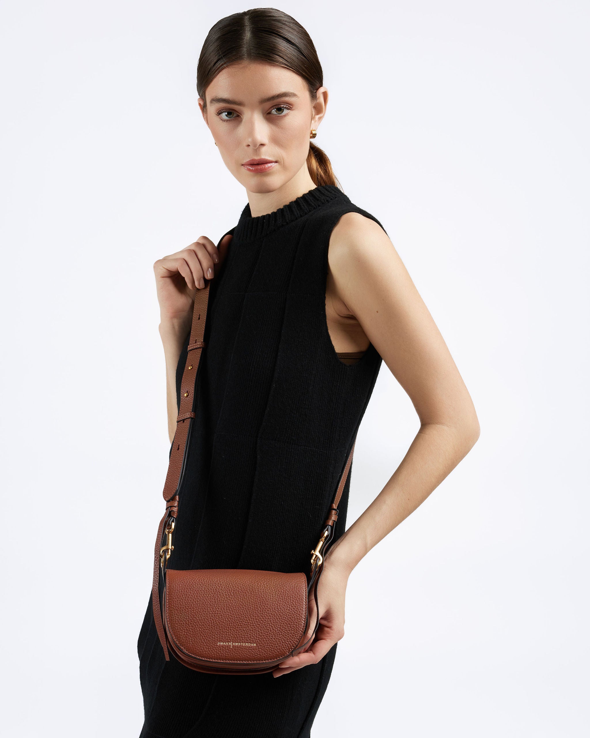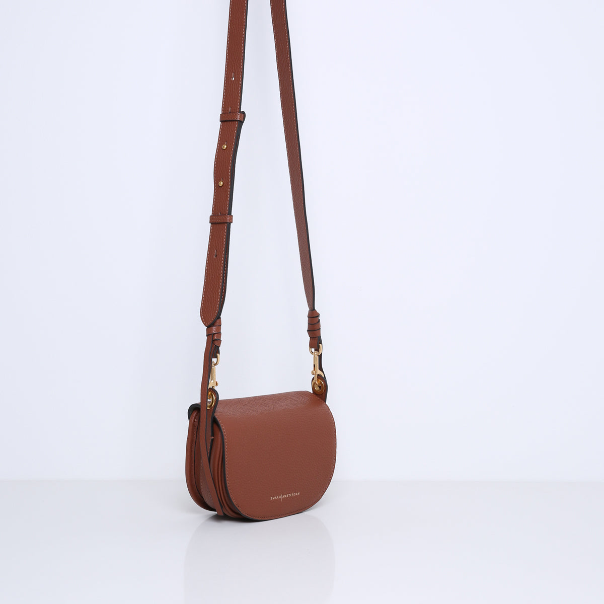 The bag closes with a flap and magnetic closure to securely store your personal belongings while also providing easy access. The wide, detachable leather strap allows you to adjust it to your desired length and is approximately 120cm long. Beautiful details include the leather fringes along the strap and the round eyelet where the strap is attached. The bag is made of soft, supple cowhide.