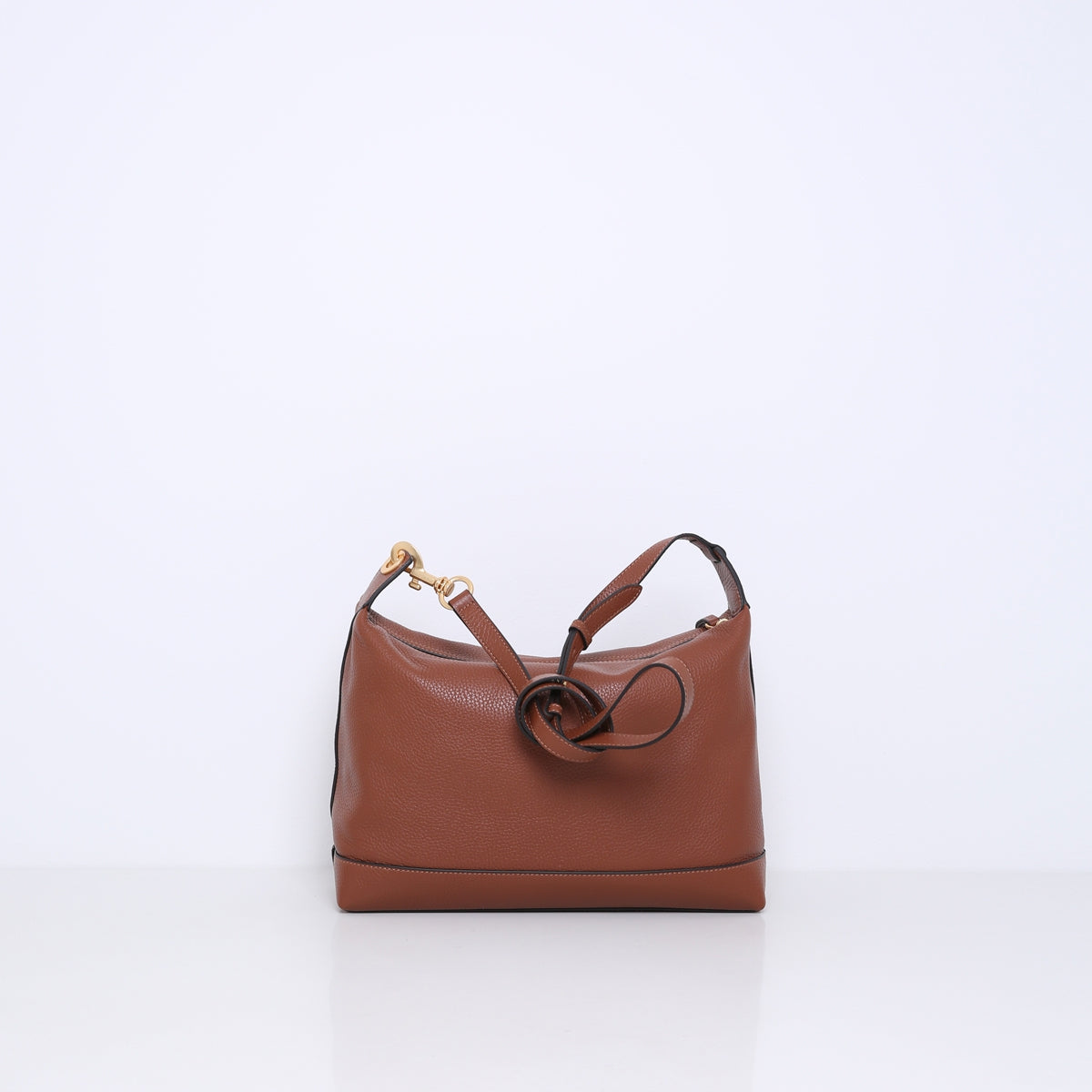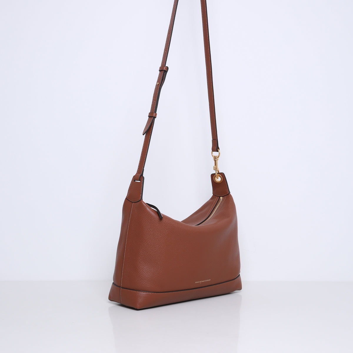 The bag is made of soft, supple cowhide. The rectangular base provides stability and a spacious interior, while the top closes with a sturdy zipper. This zipper keeps your belongings secure without compromising the bag's sleek, simple design.