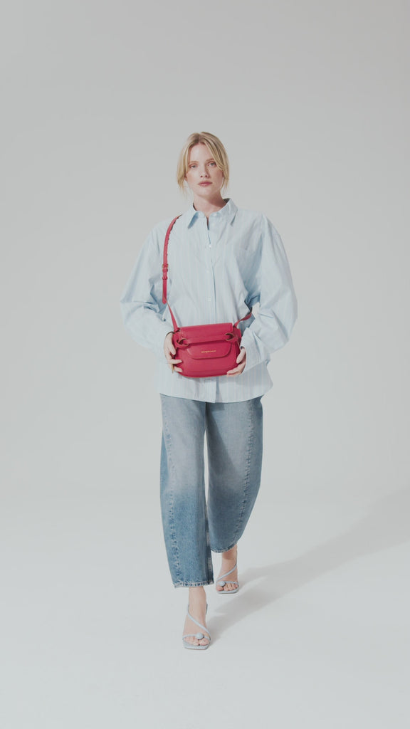 The bag is made of soft and supple cowhide leather. Has several inside pockets and is lined with fabric (viscose). The leather shoulder strap is adjustable in length and is attached to the bag.