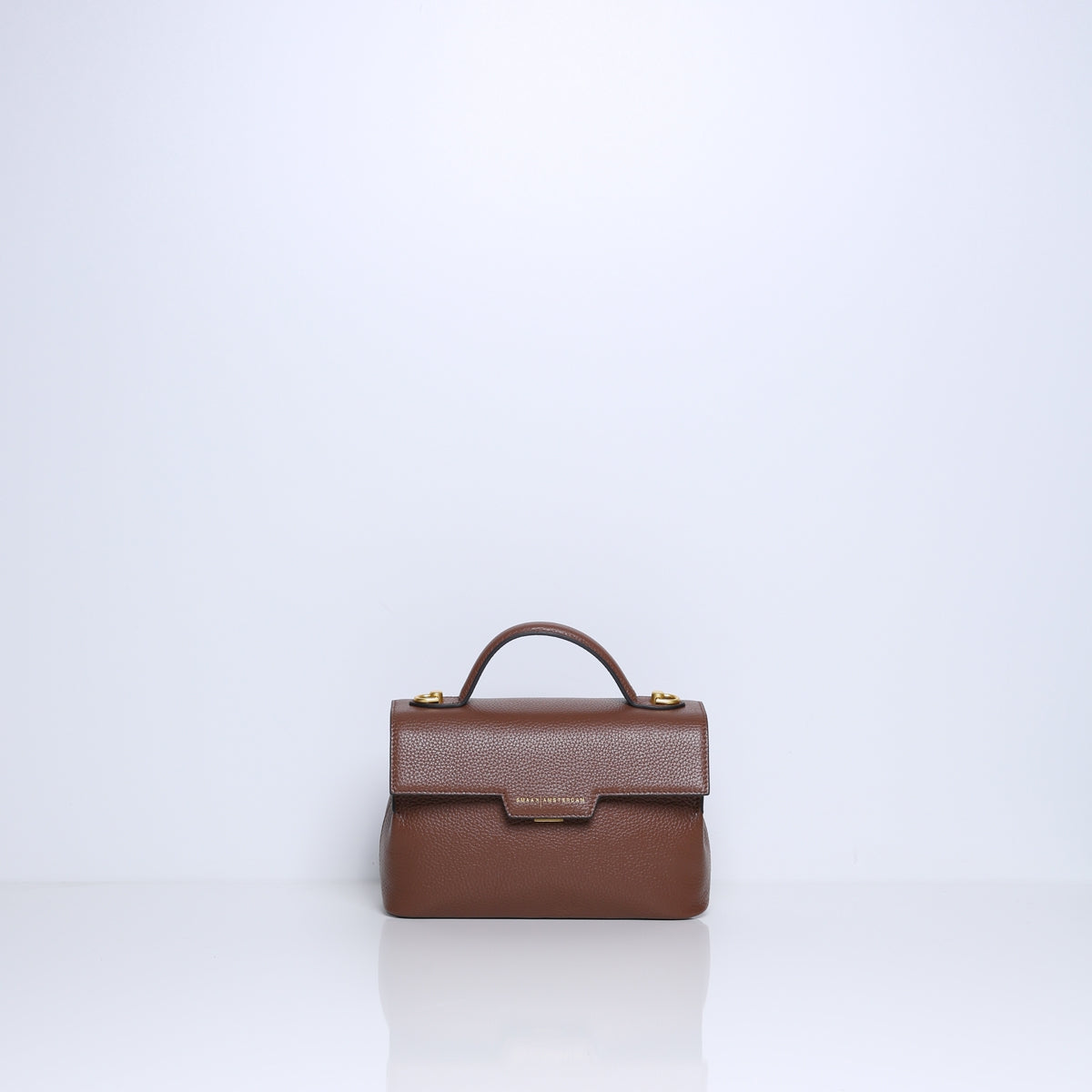 The FLORA has a short handle and a detachable leather crossbody strap that you attach to the top. The handbag opens at the front with a snap closure. There is enough room for all your essentials such as a phone, wallet, (sunglasses) and keys. The rectangular and open shape allows you to easily and conveniently access your belongings.