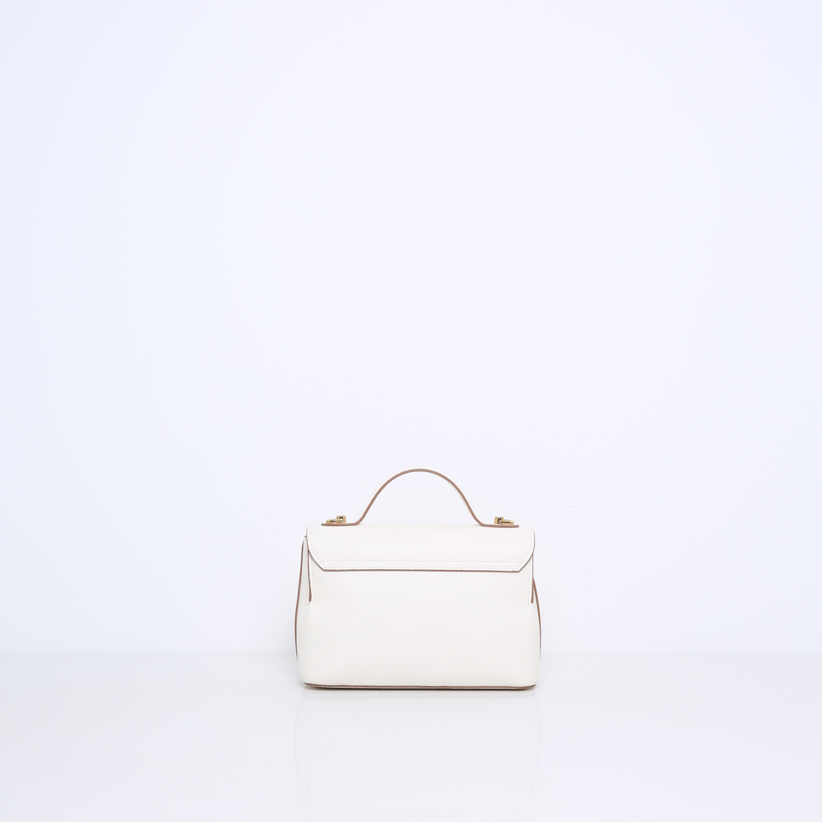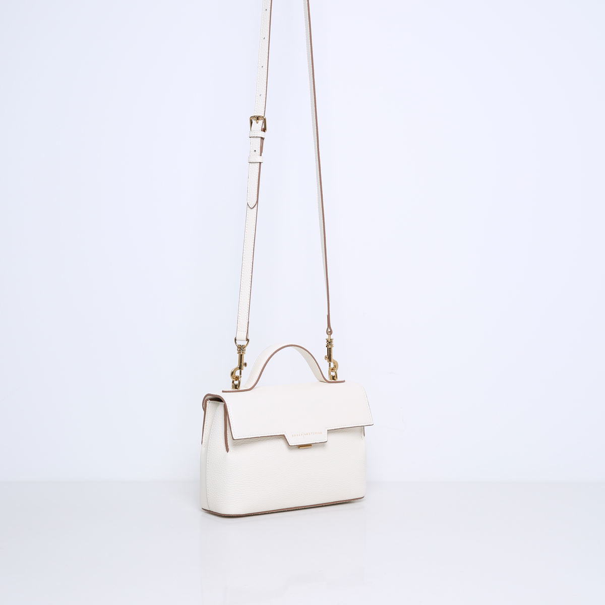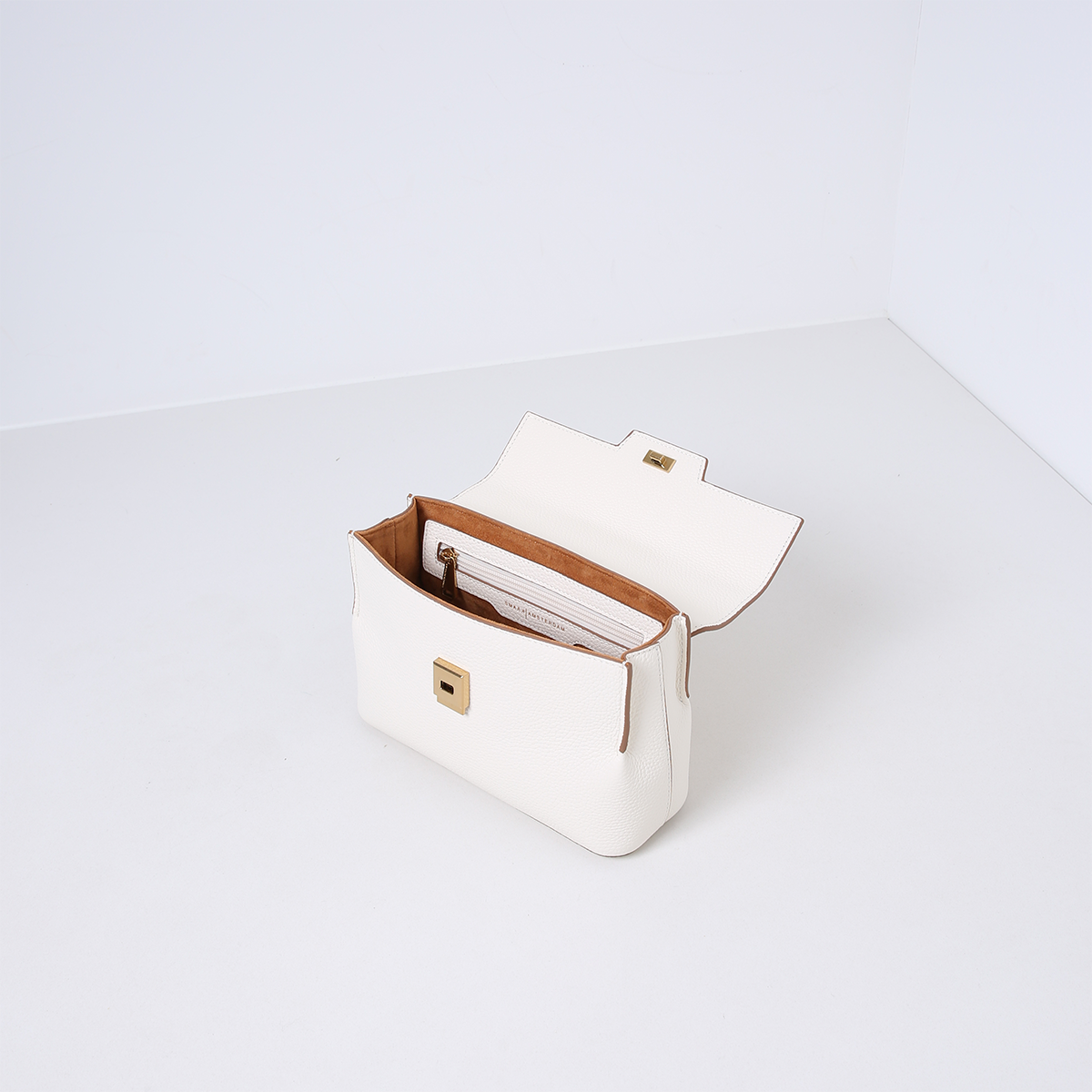 The FLORA has a short handle and a detachable leather crossbody strap that you attach to the top. The handbag opens at the front with a snap closure. There is enough room for all your essentials such as a phone, wallet, (sunglasses) and keys. The rectangular and open shape allows you to easily and conveniently access your belongings.
