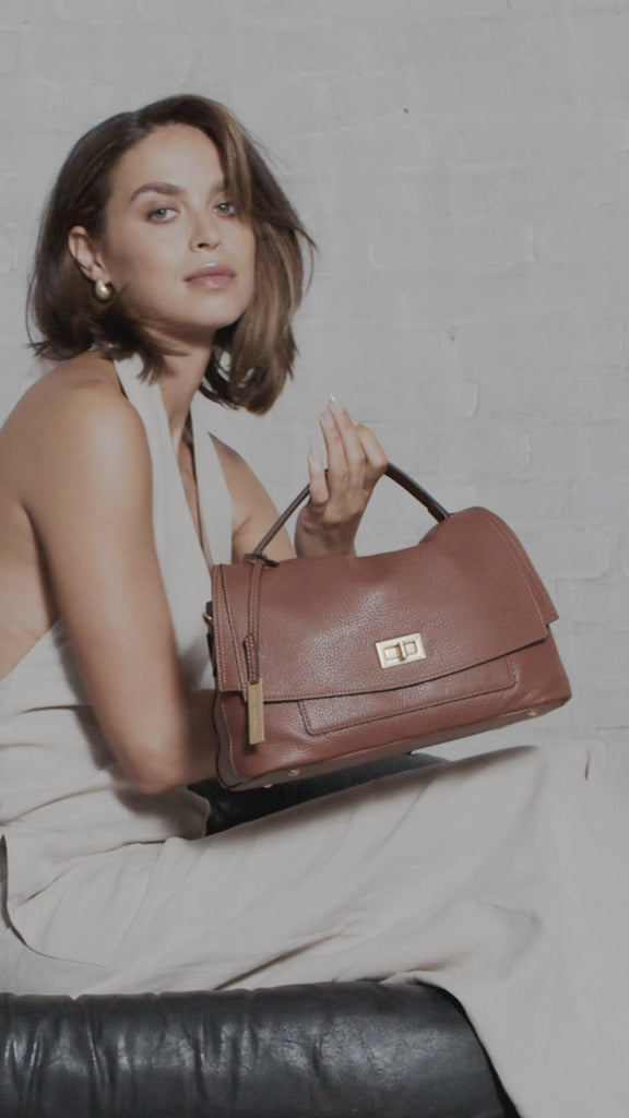 The IDA is a feminine and classic handbag. With the gold-tone twist closure on the front, the smooth shape of the bag gives it an elegant twist. The IDA fits all your essentials, but it can also hold just a little more like a bottle of water or a folding umbrella.