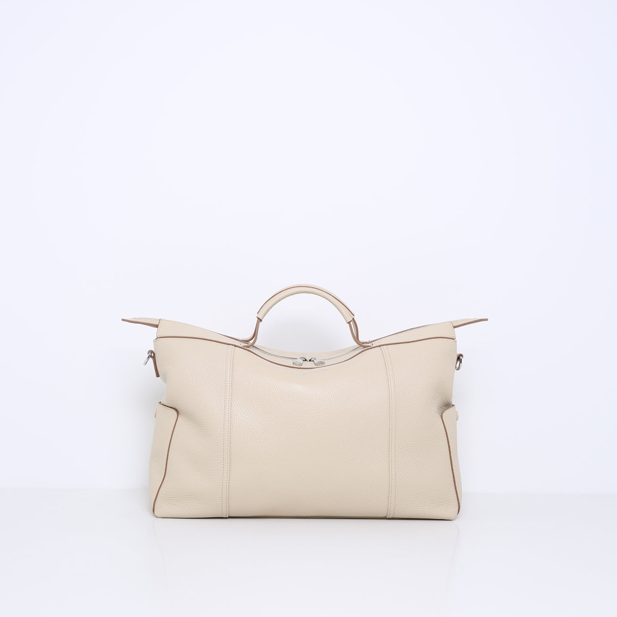 The bag is made of soft supple cowhide leather and is closed at the top with zipper.