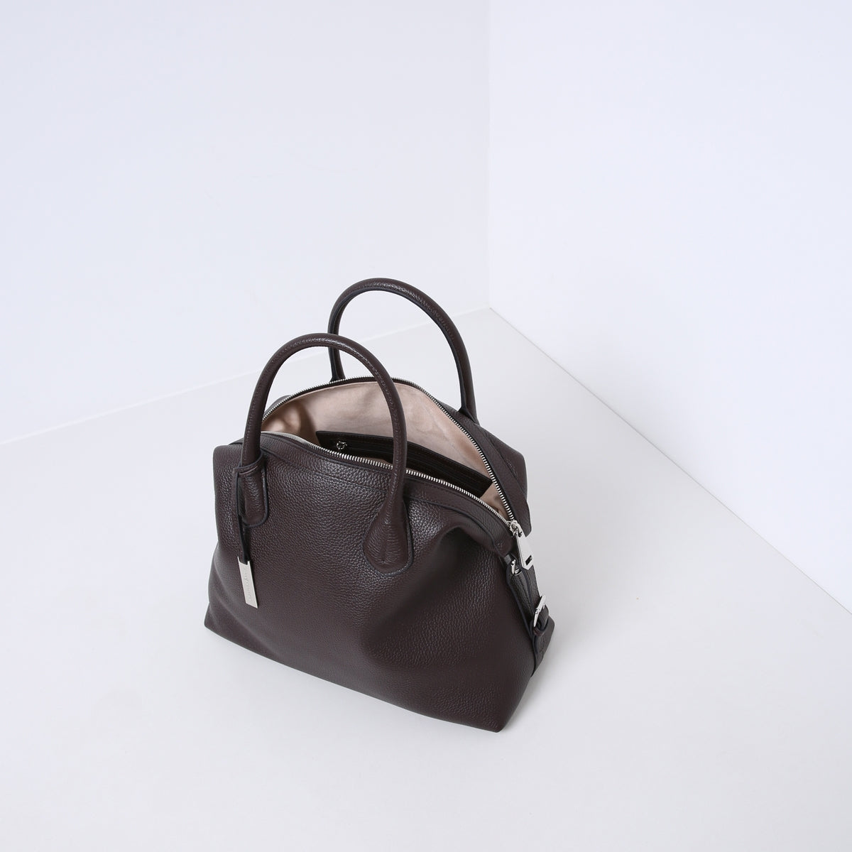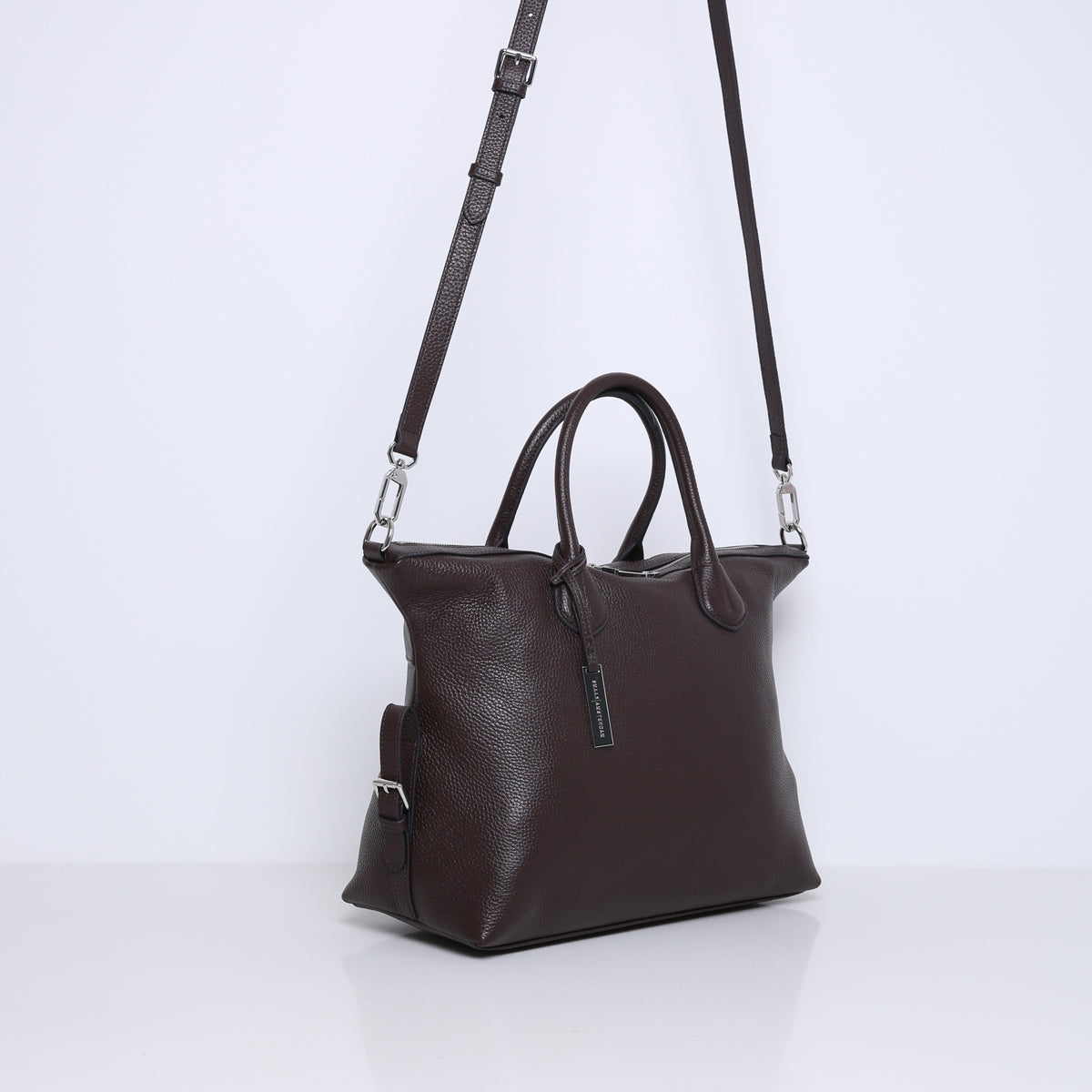 The bag is made of soft and supple cowhide leather. Features multiple interior pockets and is lined with suedine (viscose) material. With the detachable, adjustable leather shoulder strap you can also wear this handbag as a crossbody bag.