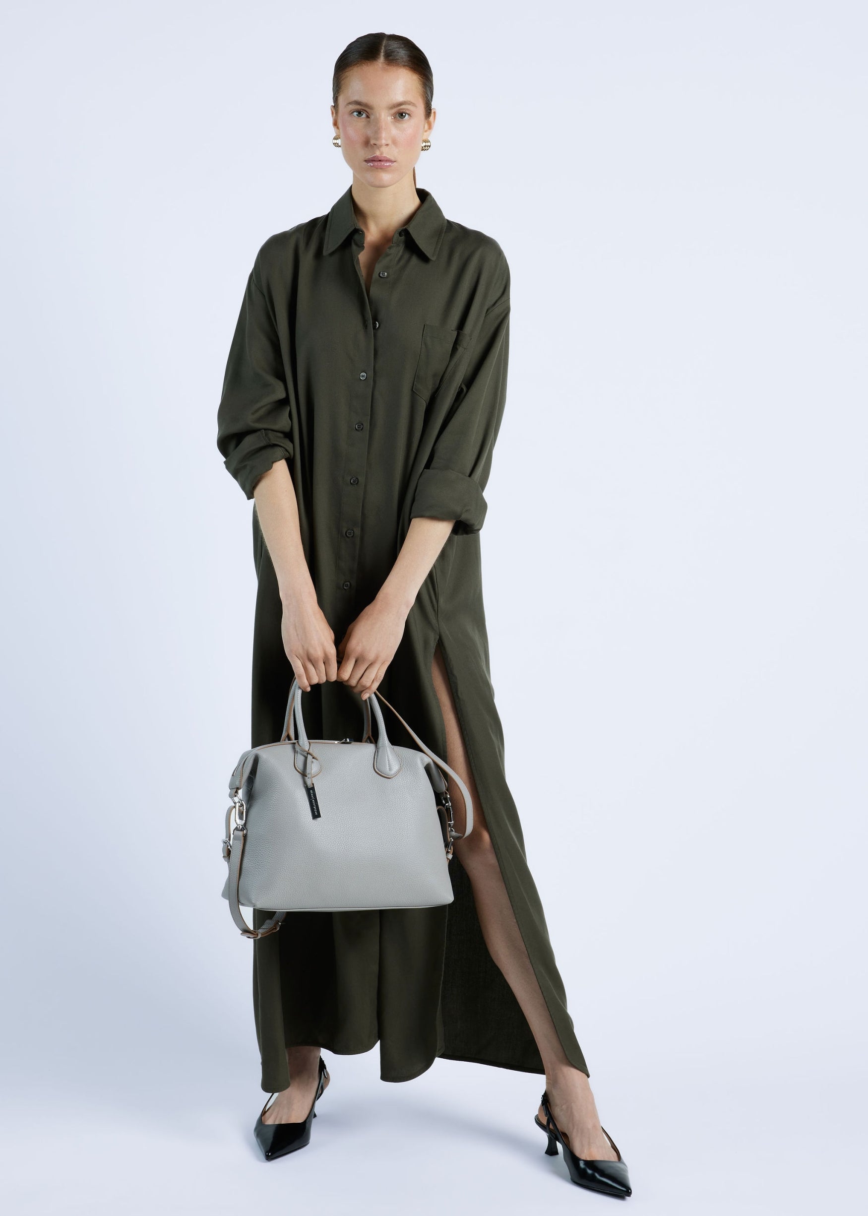 The bag is made of soft and supple cowhide leather. Features multiple interior pockets and is lined with suedine (viscose) material. With the detachable, adjustable leather shoulder strap you can also wear this handbag as a crossbody bag.