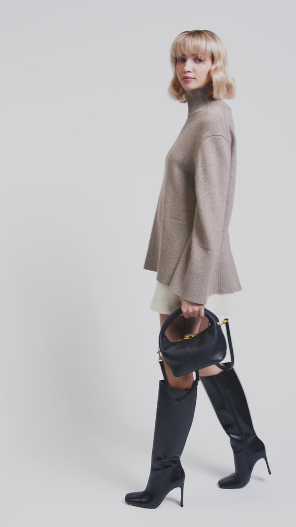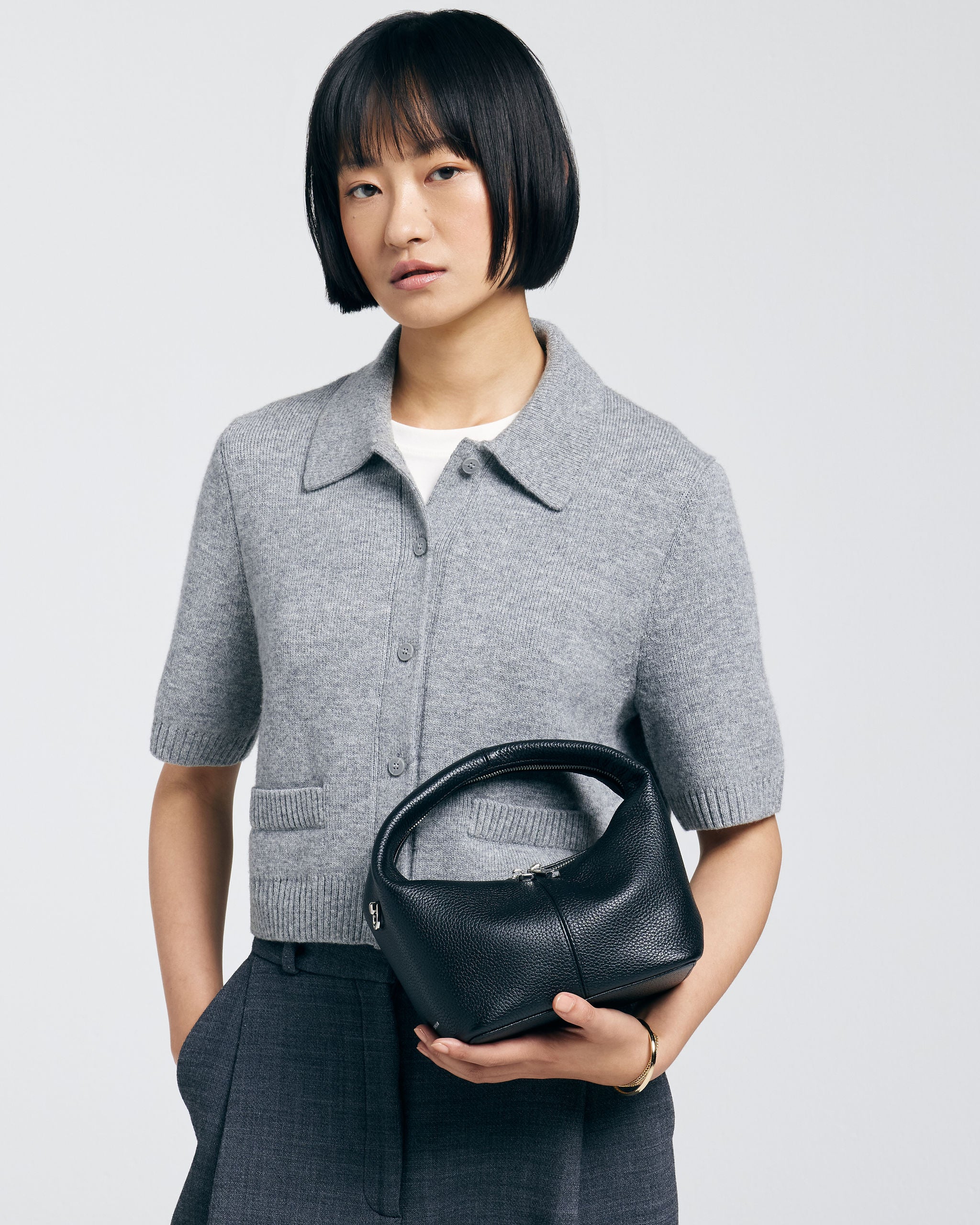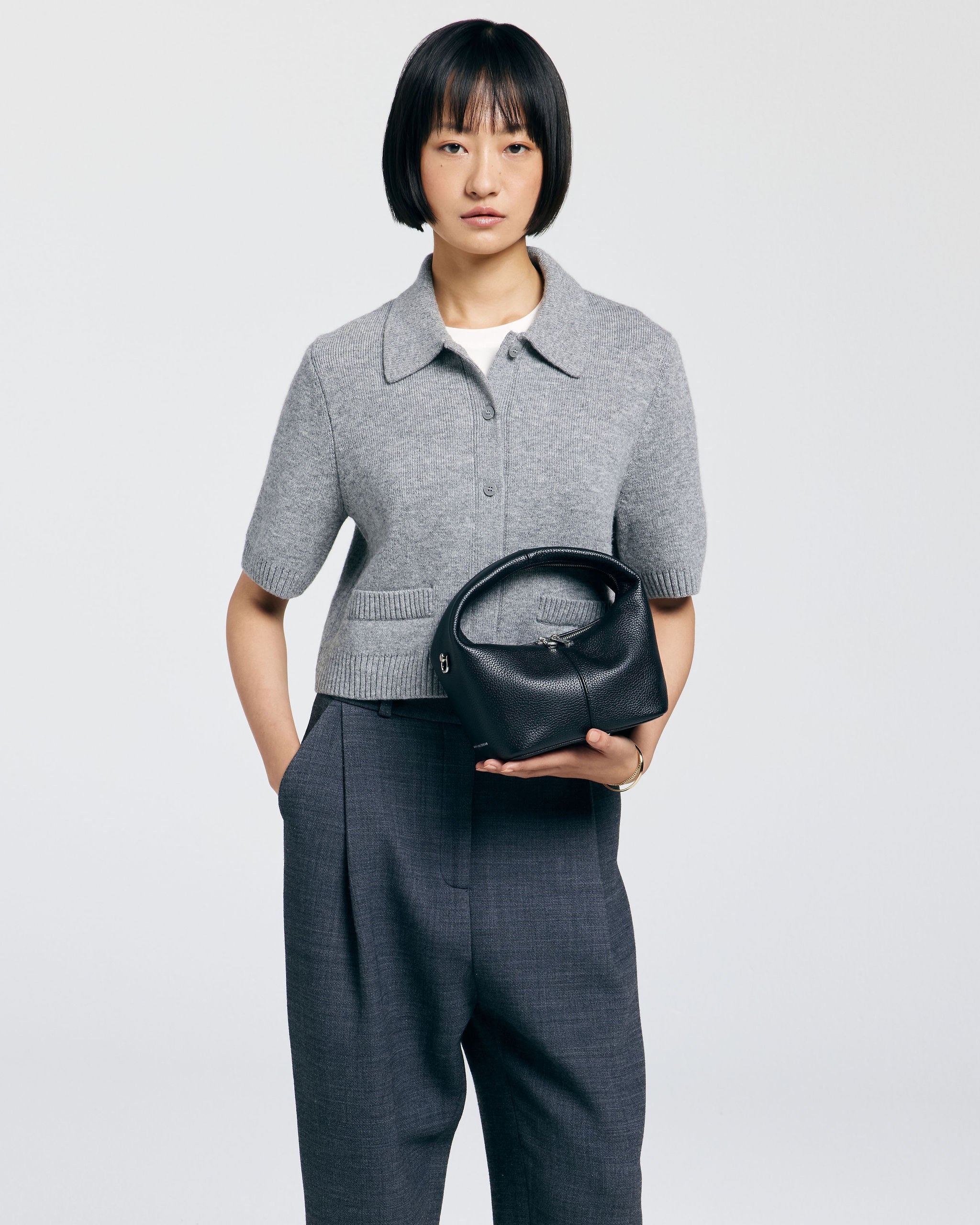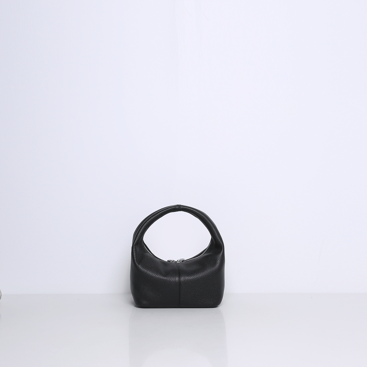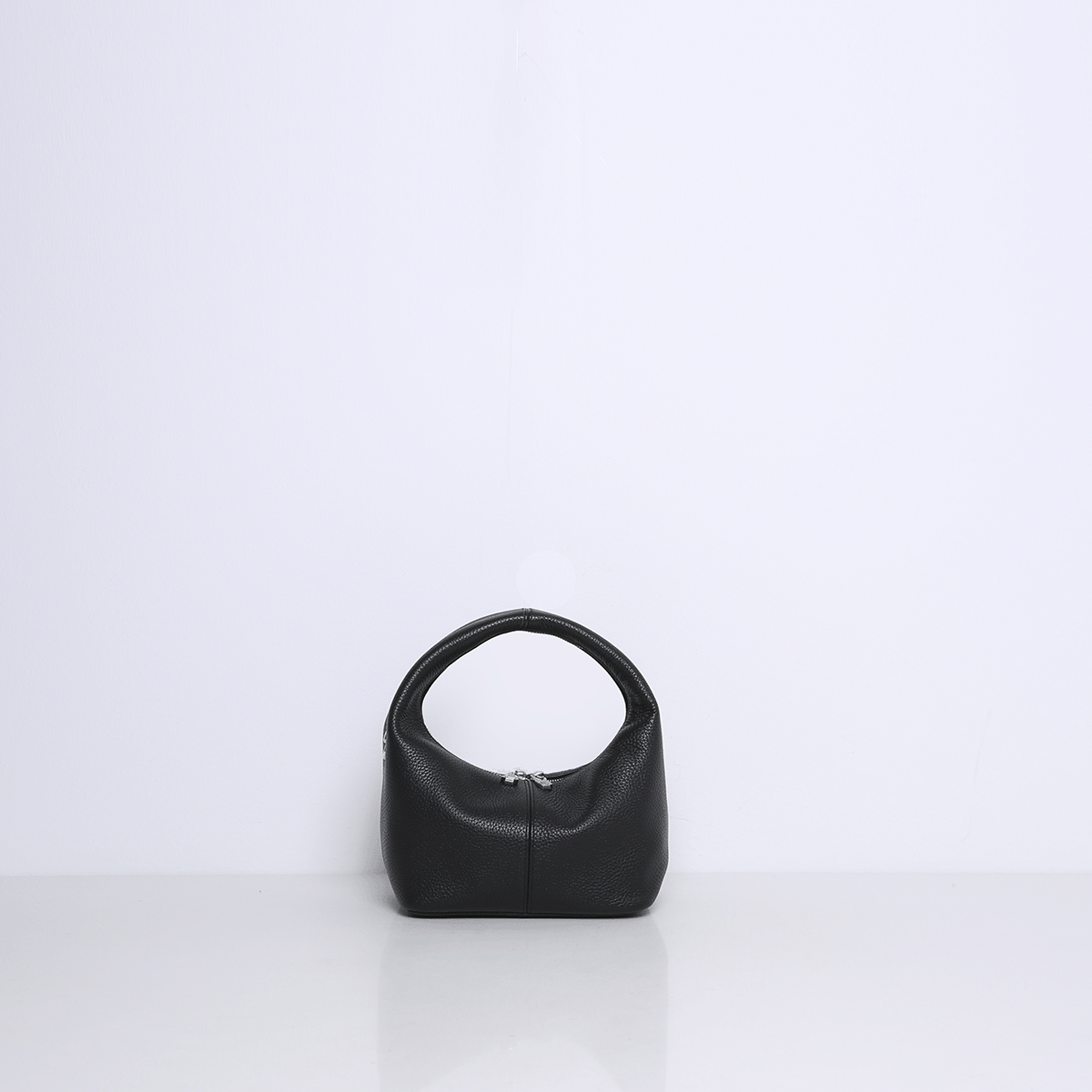 The SHELBY is a compact mini tote bag with a distinctive design. The bag stands out thanks to its round, semi-circular shape and wide leather handle. The leather feels supple and light, making the bag comfortable to carry.
