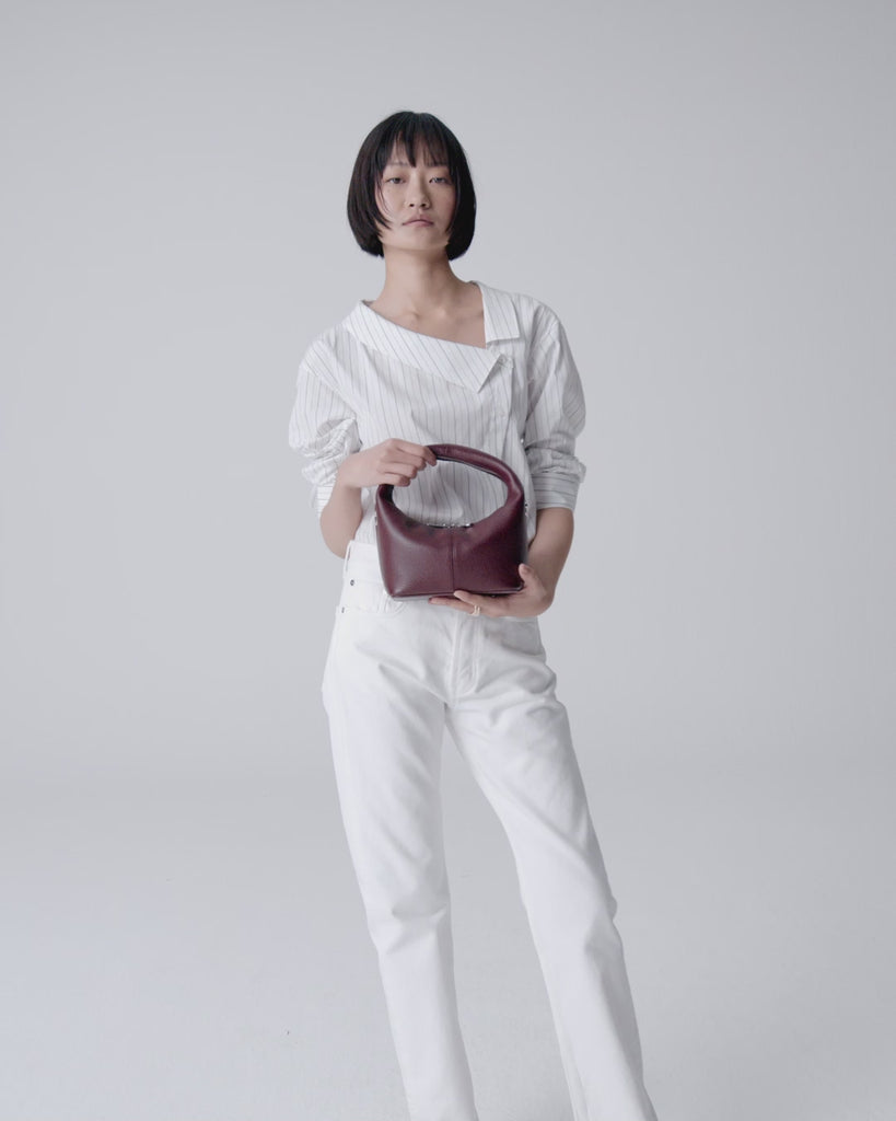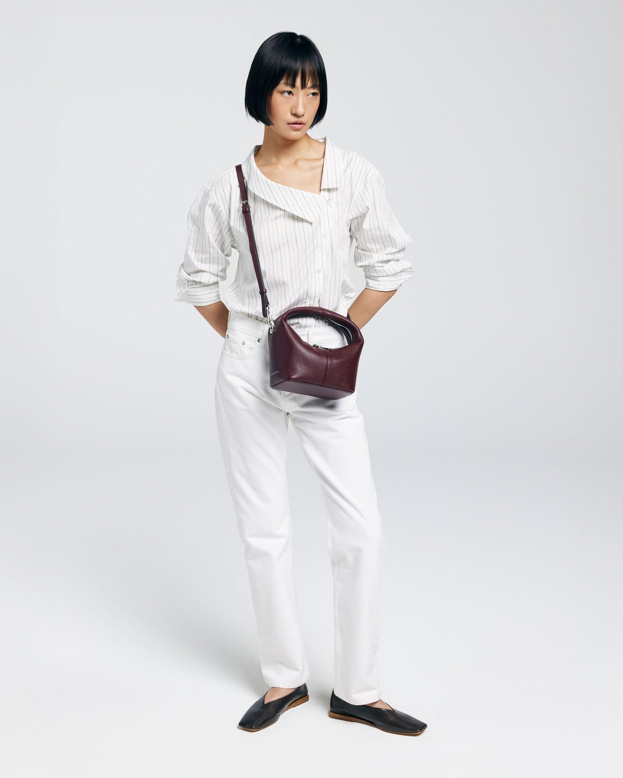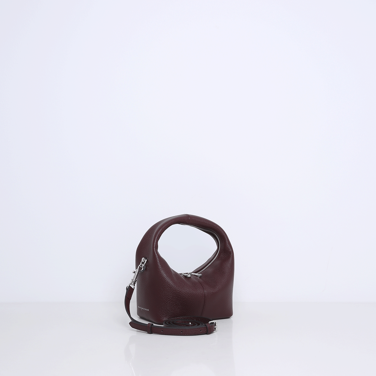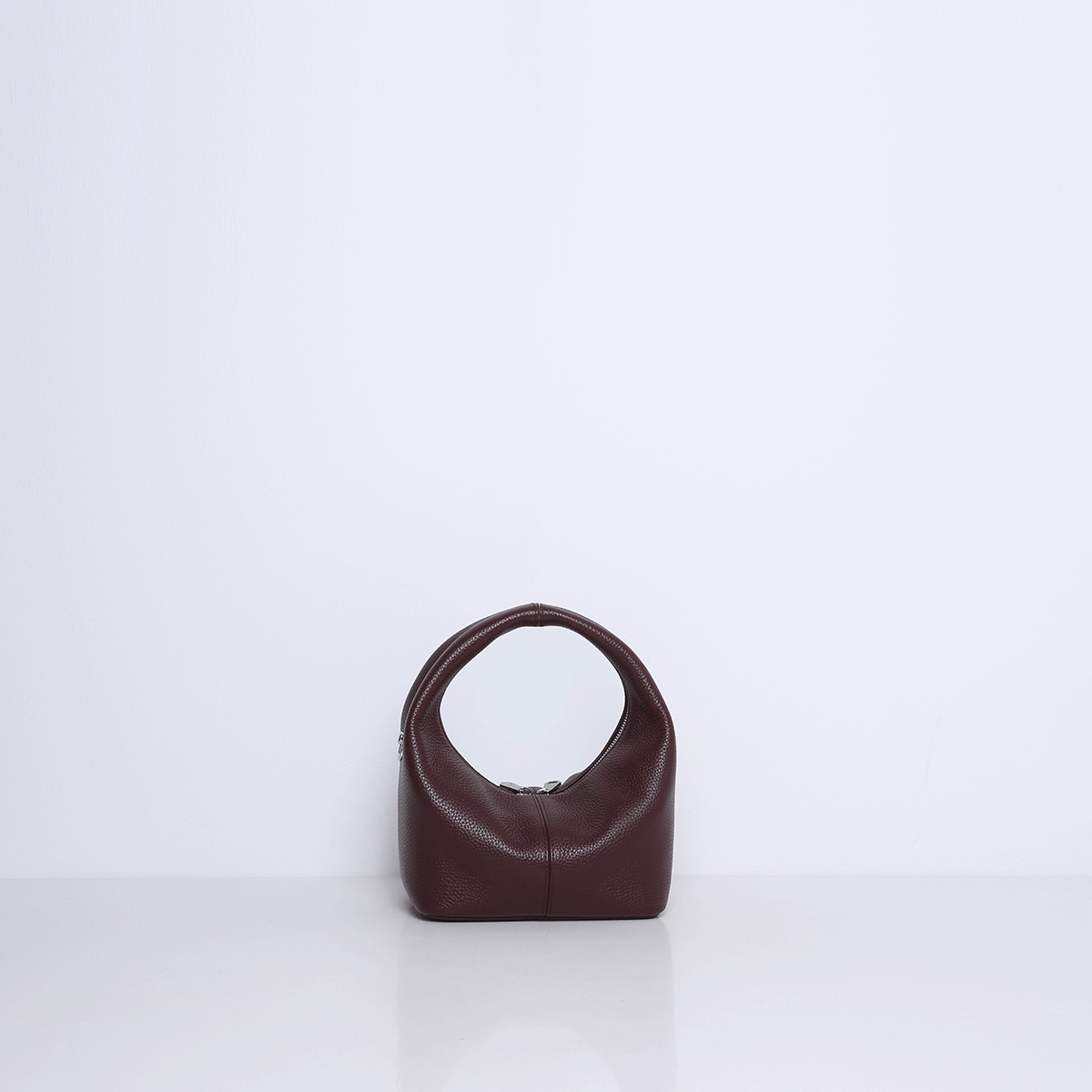 The SHELBY is a compact mini tote bag with a distinctive design. The bag stands out thanks to its round, semi-circular shape and wide leather handle. The leather feels supple and light, making the bag comfortable to carry.