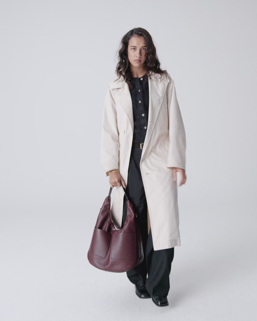 A supple hobo bag with a spacious, soft silhouette that drapes beautifully around the body. The rounded shape and subtle lines give the bag a relaxed yet elegant look. The sturdy base keeps it upright, while the leather follows your movements naturally.