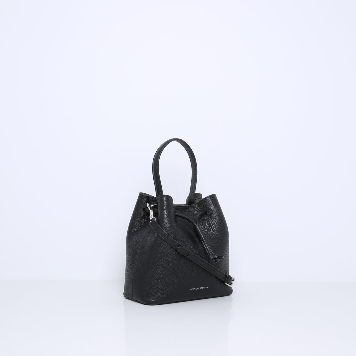 Features a knotted drawstring at the top with magnetic closure inside. Features an additional removable pouch and is lined with suedine (viscose) material.